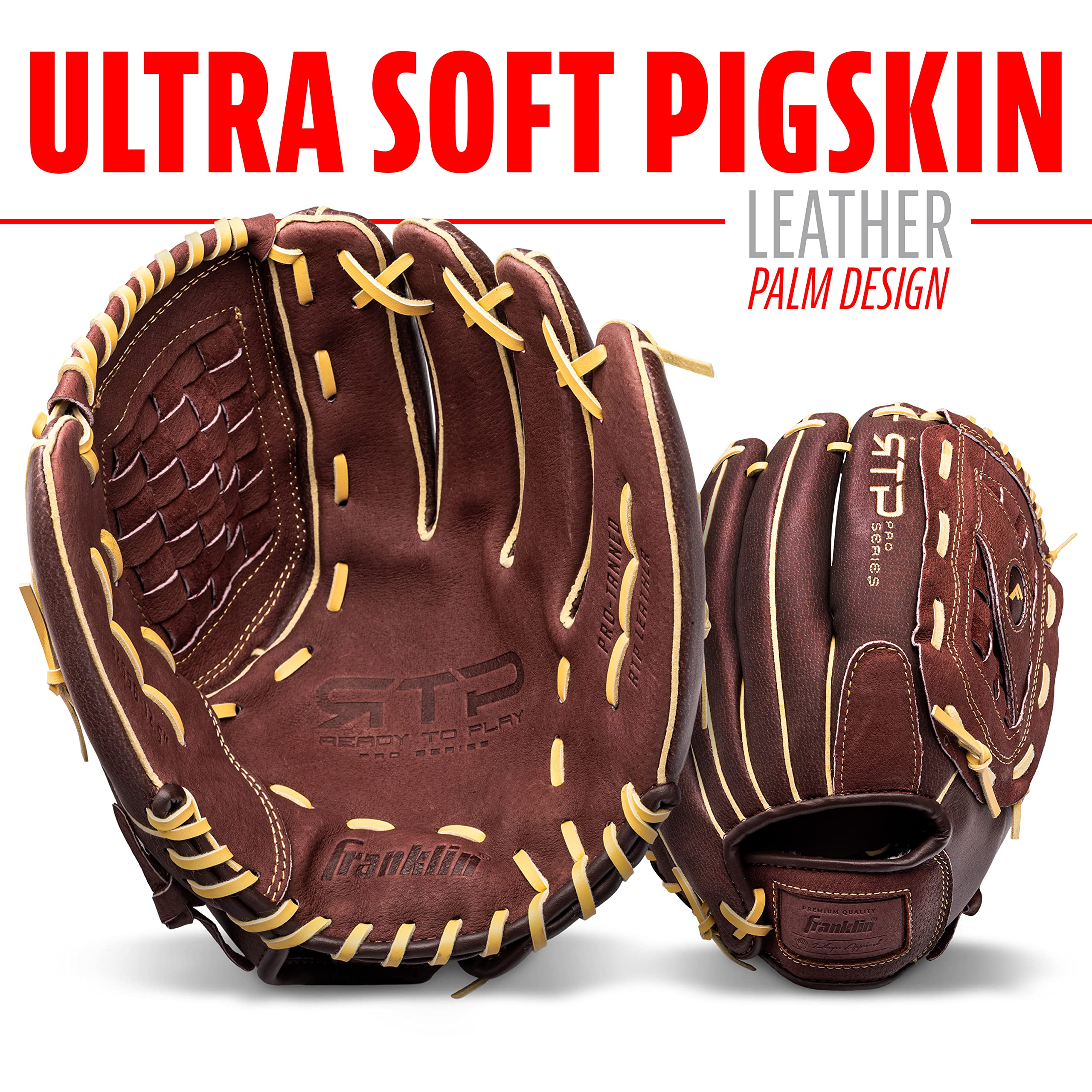 The Franklin Sports RTP Pro Baseball Glove is made from a soft, lightweight premium pigskin leather with a durable shell. This glove is comfortable to wear and built to stand up to heavy use. Plus, the soft pigskin leather is easy to shape and mold, so you can form the pocket exactly the way you want to make the break-in process quick and easy. The RTP Pro series is made for peak performance so you can take the field with confidence season after season, and with a range of sizes for all positions, all you need to do is pick your favorite and hit the diamond today!