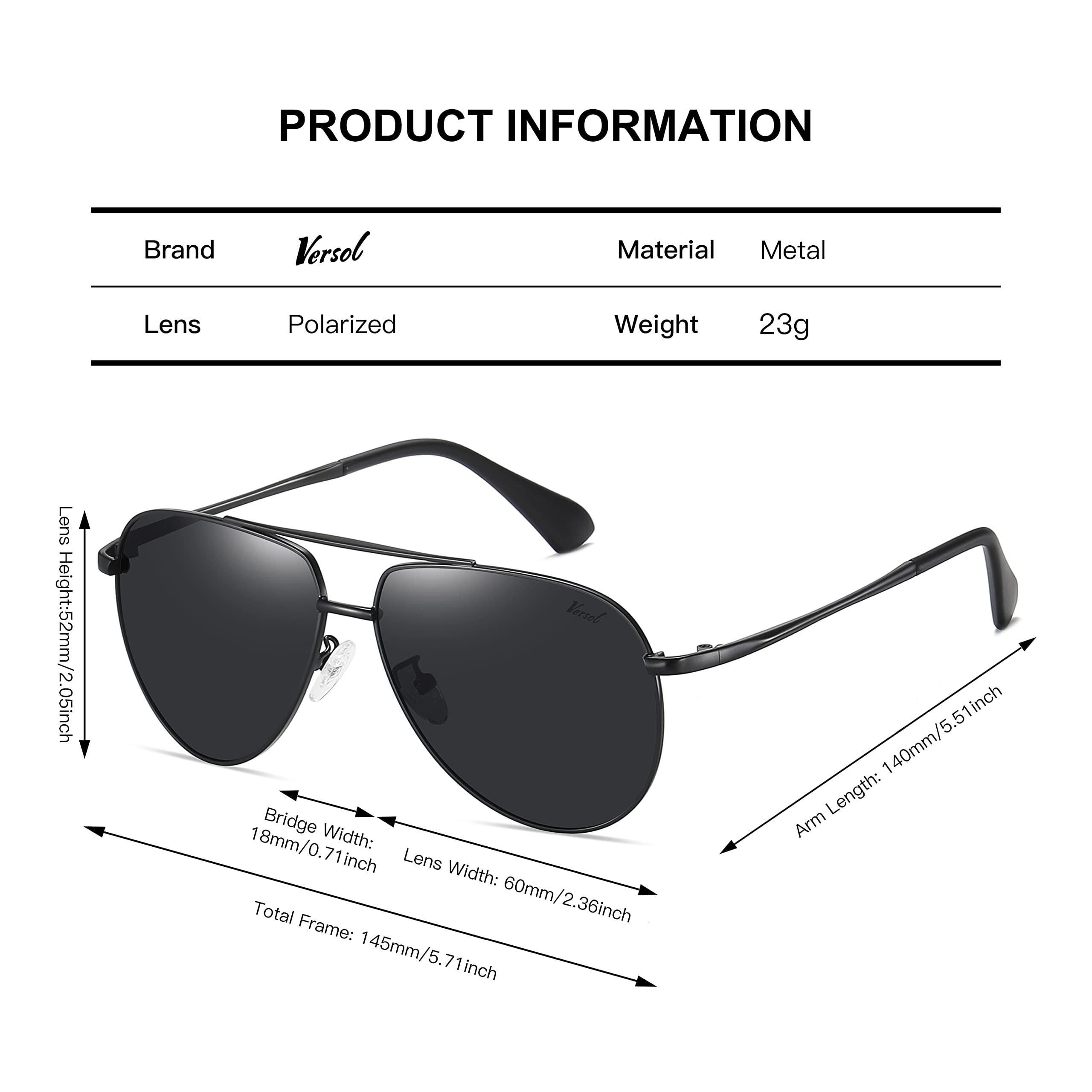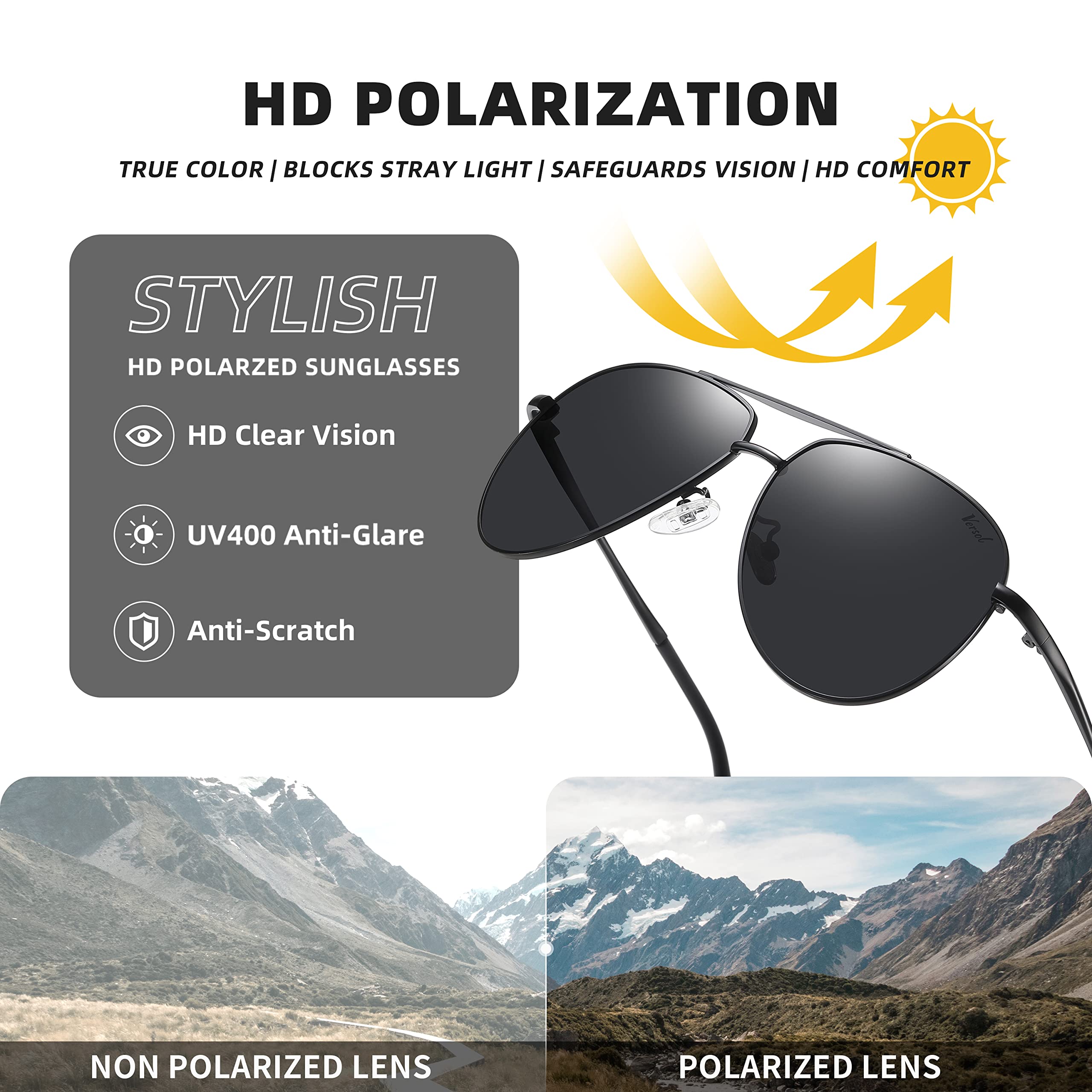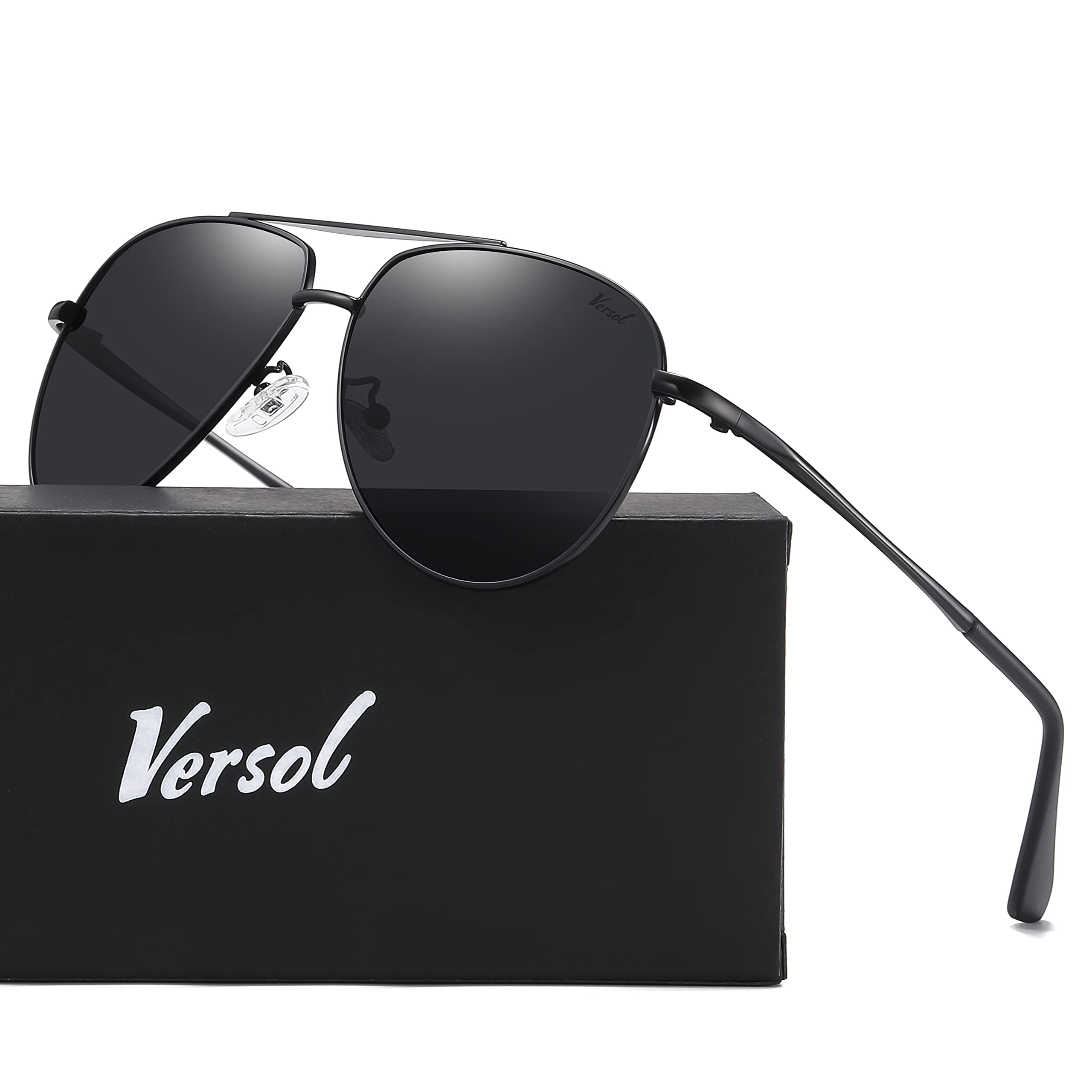 Description: Why should you choose Versol Polarized Aviator Sunglasses? 1. Each pair of Versol sunglasses offer 100% UV400 protection. High-definition lenses give you a natural, clear vision, offering you full protection while driving or during outdoor activities. YouÕll be able to rock these shades during any seasons. 2.The aviator sunglasses with multiple lens colors are available for any style. The stylish unisex design makes it as high fashion accessory and daily wear all year round, fits with any ensemble. A wonderful, yet practical gift idea for friends and family! 3.After-sales Guarantee: We always offer the best customer service. If you have any problems with the UV protecting sunglasses, please just feel free to contact us as soon as possible. we will provide you with timely, satisfactory solutions. Friendly Notice: 1. Do not clean your sunglasses with paper towels or clothing, or it will leave scratches. 2. Do not leave your sunglasses under a car's front window for a long time, especially during the summer. Package Included: 1 * Versol Women Men Aviator Sunglasses 1 * PU Leather Pouch 1 * Soft Glasses Cloth 1 * Exquisite Package Box