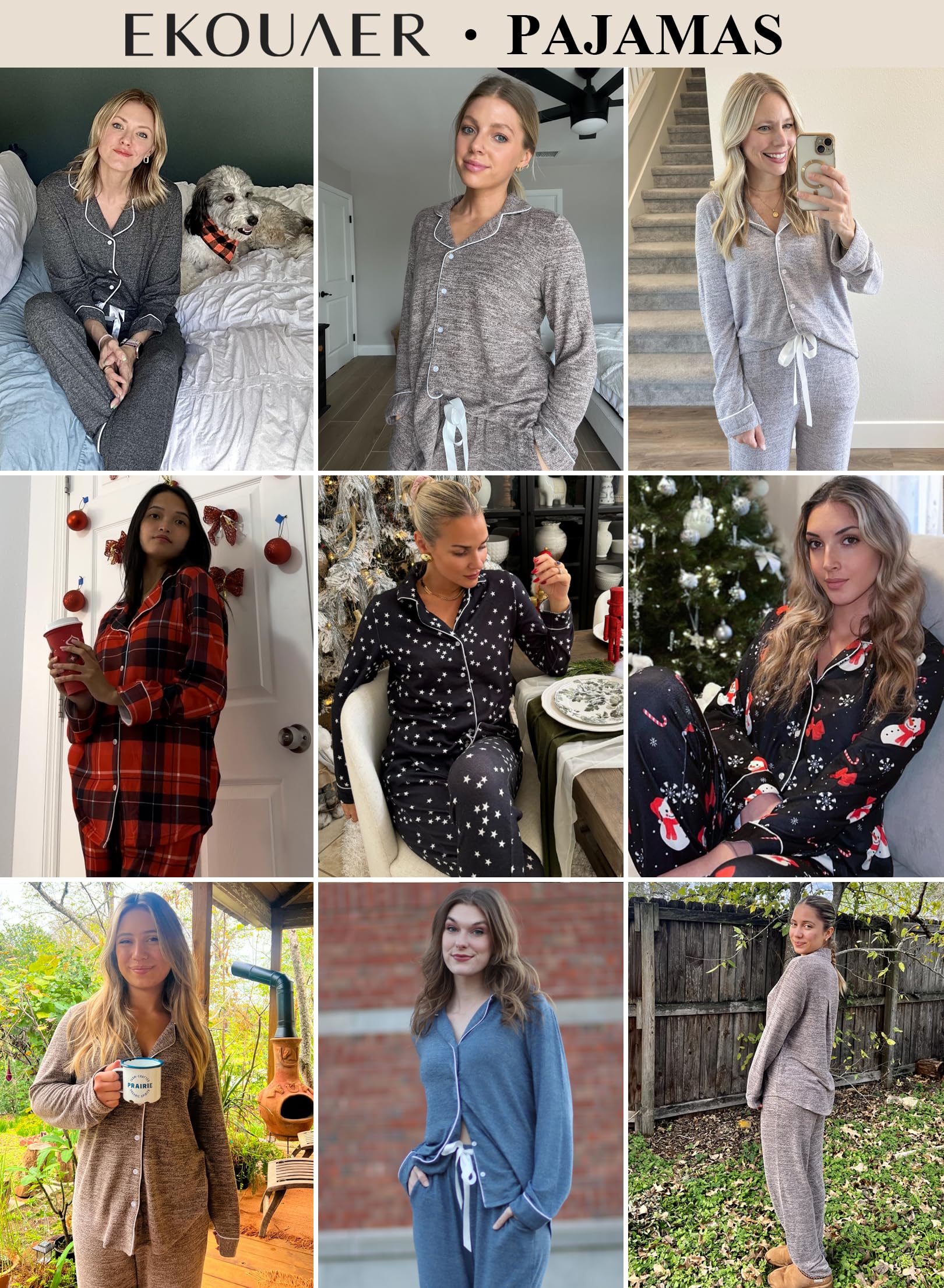 Ekouaer Sleepwear Women’s Long Sleeve Pajamas Button Down Loungewear with Long Pants Pjs Set S-XXL Ekouaer sleepwear with Premium fabric.Ultra lightweight,cozy and soft cashmere pajamas set.Women’s two piece pjs set featuring casual sleepwear set style.Long sleeve sleep top and long pjs pants set.This lounge set with superior stitching and perfectly-lined hems.Elegant and Classic sleep set. Long sleeve pajama set with notch collar pajama shirt,button front sleep shirt and one chest pocket design.And Long sleep pants with two side pockets and chiffon drawstring elastic waist.This two piece pajamas for women is the best sleepwear.This sleepwear set is perfect for sleepwear,loungewear,casual wear,pajama parties, dorm rooms, fun family pictures.And this cashmere fabric that is great for as a gift to your mom,wife,daughter and friends. This material is very warm and comfortable. Very suitable for autumn and winter two piece pajamas. Ekouaer premium fabric is the perfect choice for all of your sleepwear needs. Pajamas Features: One Chest Pocket Long Sleeve sleep set Full button front night set Elastic waist with drawstring Long pants with satin tie decoration Durable and delicate stitching that will last Machine washable Warmth Warning Garment Care: Hand-Wash(Max 40°C) About Size:There are 5 sizes (S/M/L/XL/XXL) available for the following listing. please allow 1-2cm differs due to manual measurement, thanks (All measurement in cm and please note 1cm=0.3937inch)
