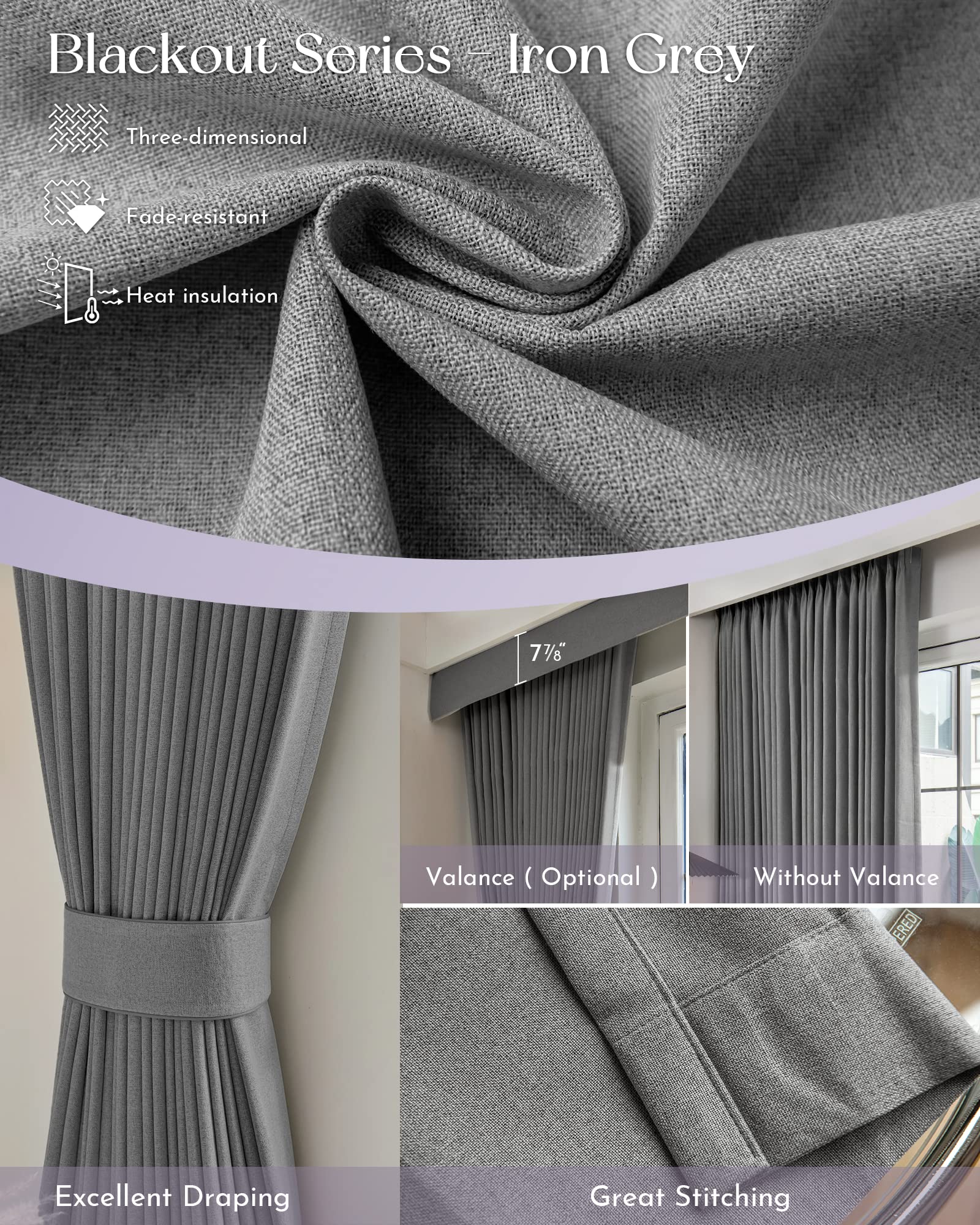 - 100% Blackout fabric: Cotton linen blended fabric, reveals a calm atmosphere of charm. Totally block the passage of light, superior in privacy protection, Thermal insulation, uv protection and energy Saving. Excellent draping and stitching, soft to touch. Removable fade-resistant cloth and machine washable.