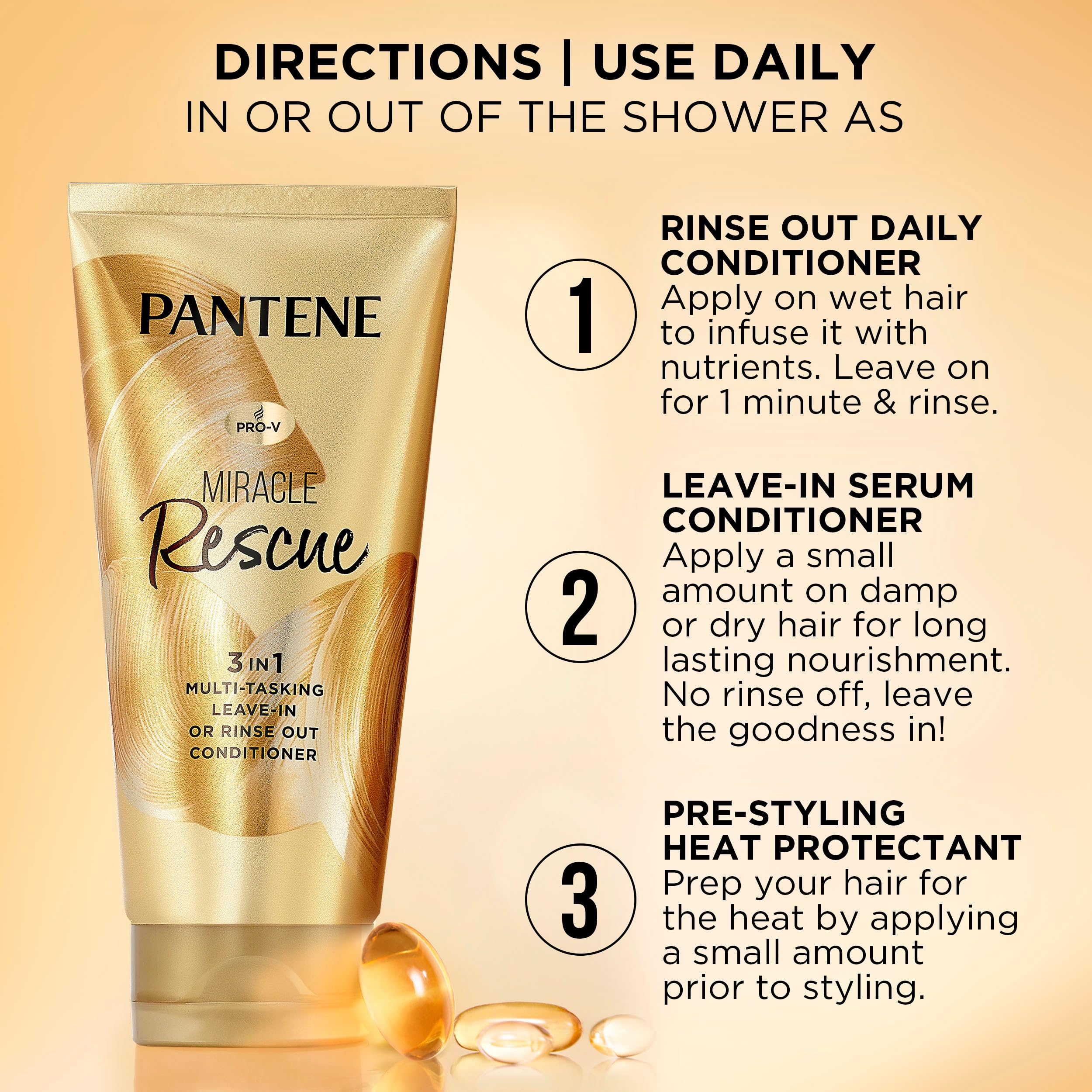 LEAVE-IN OR RINSE-OFF RESCUE Is your hair in need of a rescue? Reach for Pantene Pro-V Miracle Rescue 3-1 Multi-Tasking Leave-In Conditioner or Rinse-Off Conditioner. This formula moisturizes, protects from heat, detangles and prevents frizz - so many multi-tasking benefits, all in one bottle! Crafted with a multi-vitamin complex, you can use Miracle Rescue in or out of the shower, so your strands can always have the protection they need.HOW TO USE There are three ways to rescue your strands with Pantene Pro-V Miracle Rescue 3-1 Multi-Tasking Leave-In Conditioner or Rinse-Off Conditioner. To use as a conditioner, apply on damp or dry hair after shampooing, paying special attention to ends. Rinse if you like, but leave it in for the most benefits! To use as a heat protectant, apply all over before styling.