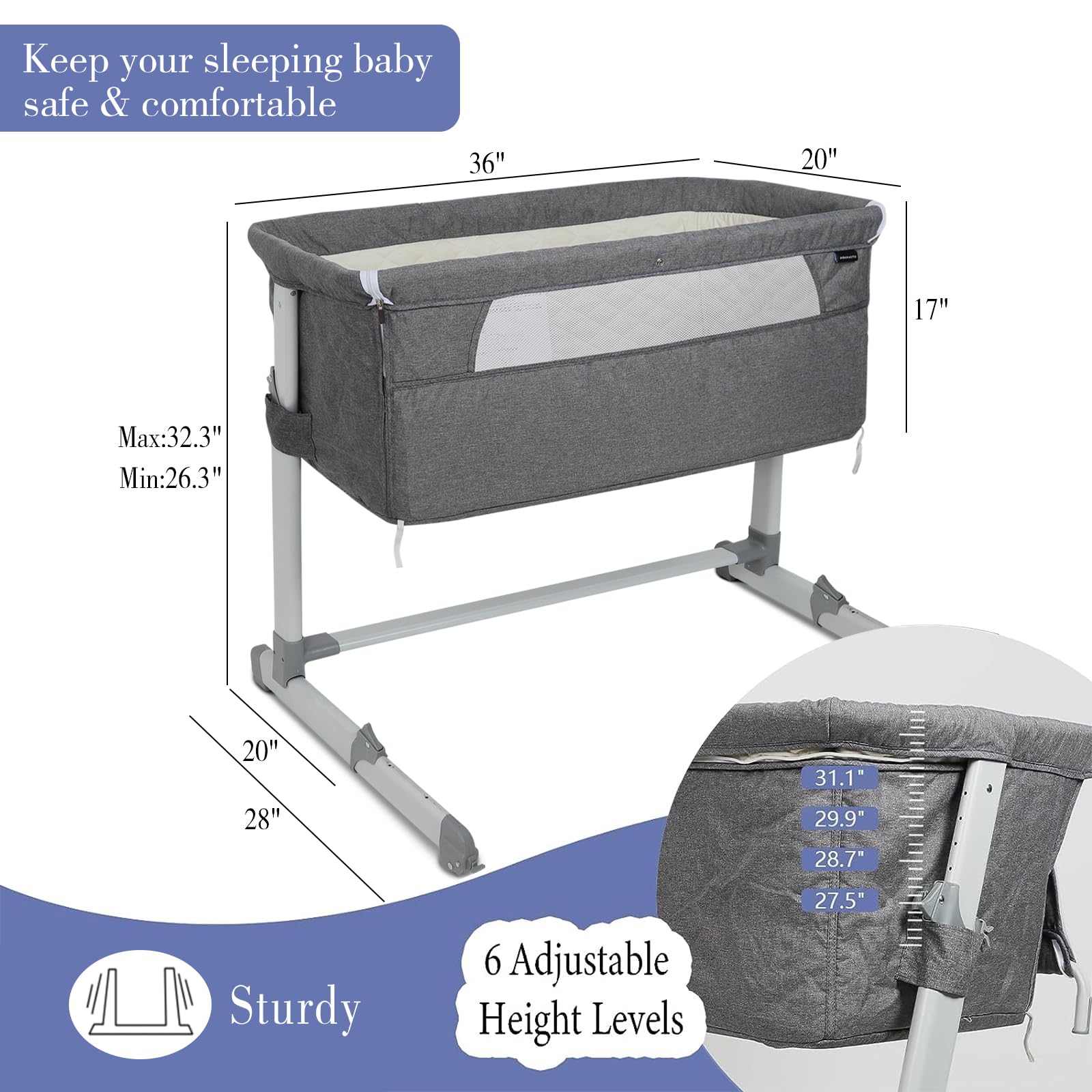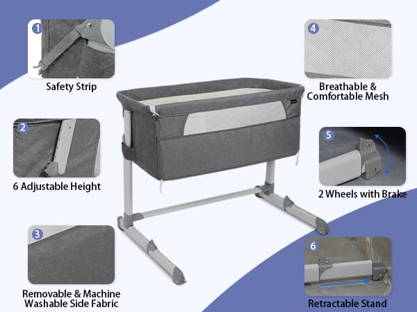 - 6 Adjustable Heights: The baby bassinet has 6 adjustable height positions (26.3"-32.3") Fits most adult beds and a variety of scenarios. Adjustable feet can be retracted close to the bed, which can keep your baby closer to you.