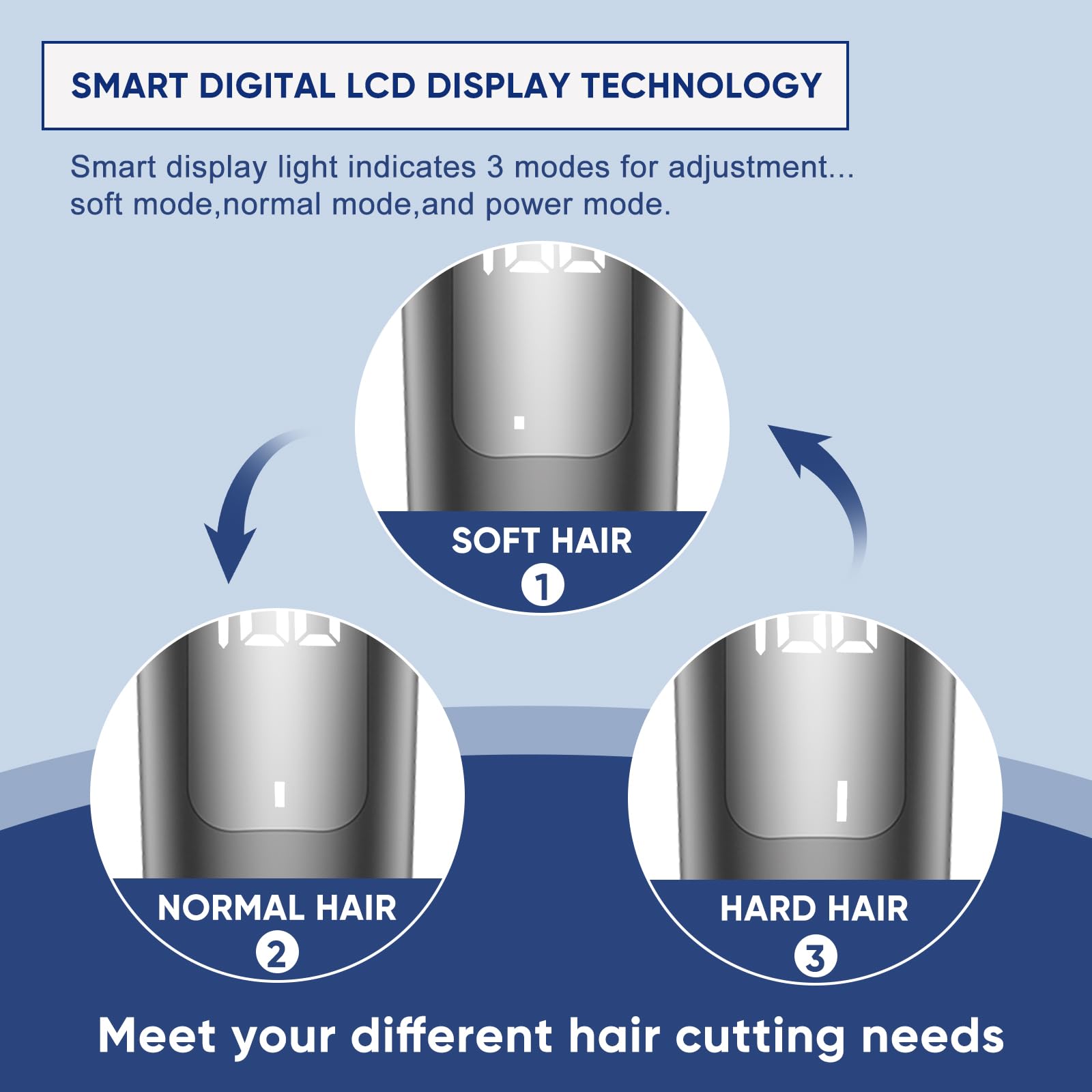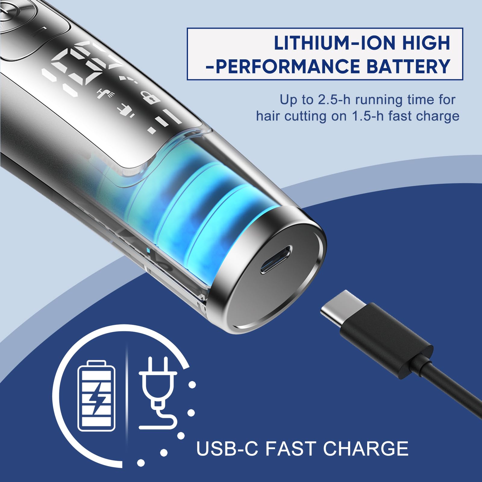 - Smart Display & Fast USB-C Charging Technology: 1.5 hours fast charging, long runing time up to 150 minutes (Built in rechargeable 1200mAh lithium battery). The intelligent display screen technology allows you to have a clearer understanding of the usage status of the hair clipper, making it easier for you to use safely.