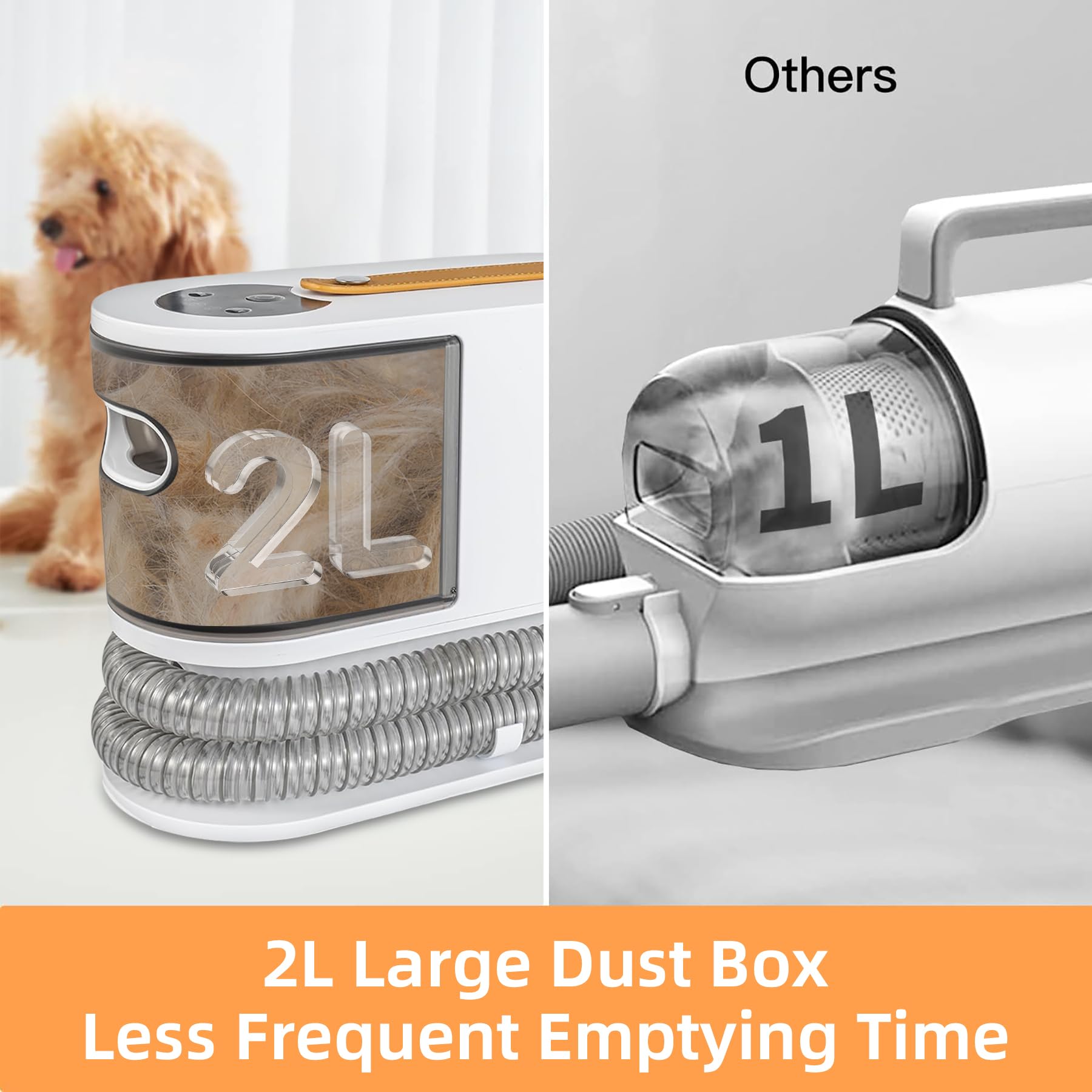 - 2L Large Dust Cup & Easy Empty- Dog vacuum groomer with a detachable 2L large dust box, It can ensure sufficient capacity to storage your pet hair. Even if you have a long haired pet, you don't need to frequently empty it when pet grooming. It comes with 4.6FT(1.4m) extended hose to keep your pets far away from the motor noise, which makes it ideal for dog vacuum for shedding grooming and maintaining a tidy space.