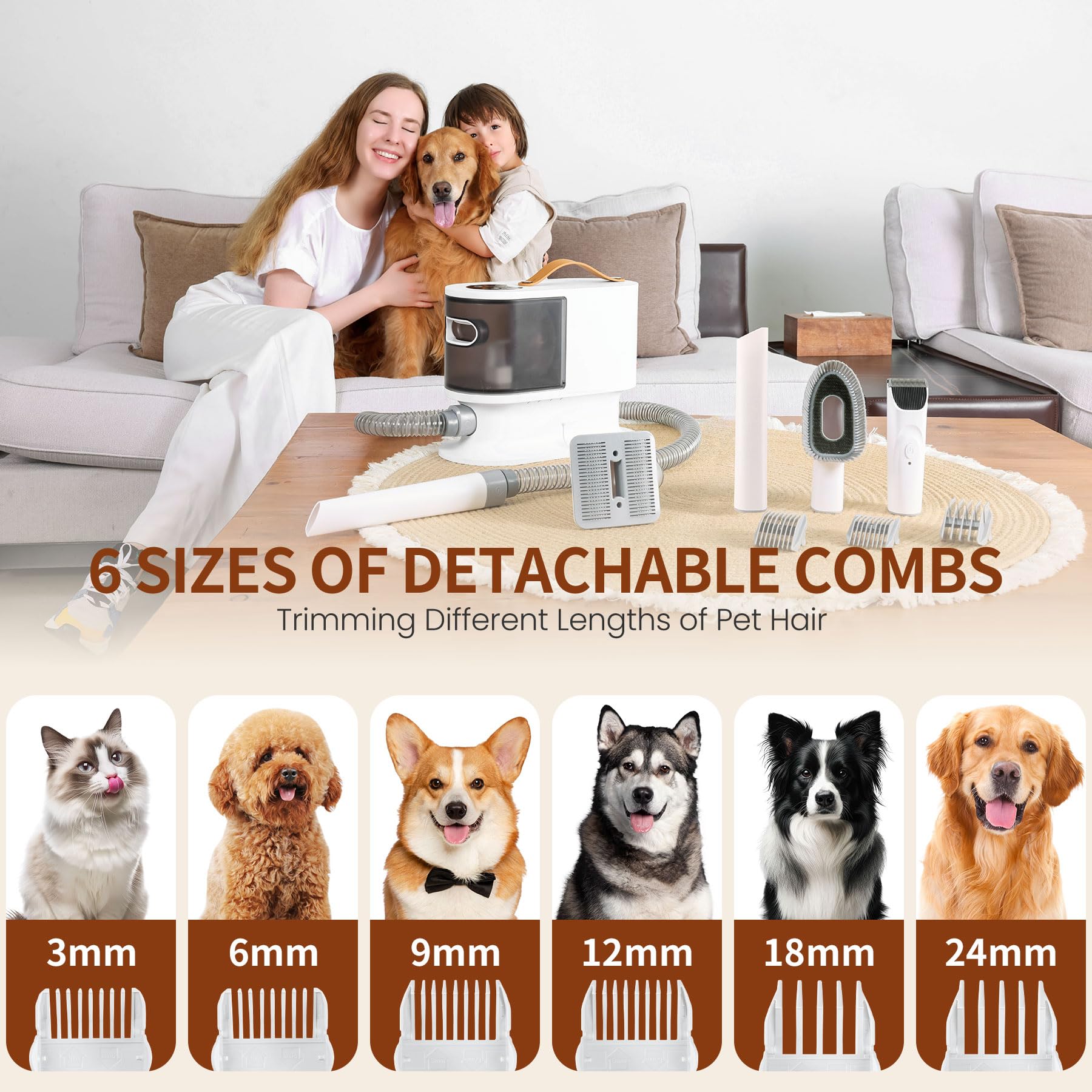 - 3 Suction Levels & 6 Interchangeable Guide Comb - Pet grooming kits has 3 adjustable suction levels(12kPa, 8kPa, 7kPa), which enhancing the grooming experience for your pet. Ideal for dogs and cats who need a stress-free grooming session. The grooming kit for dogs includes six guide combs of various sizes (3mm, 6mm, 9mm, 12mm, 18mm, 24mm) for trimming hair at different lengths, which allows for quick and easy changes, adding to its versatility.