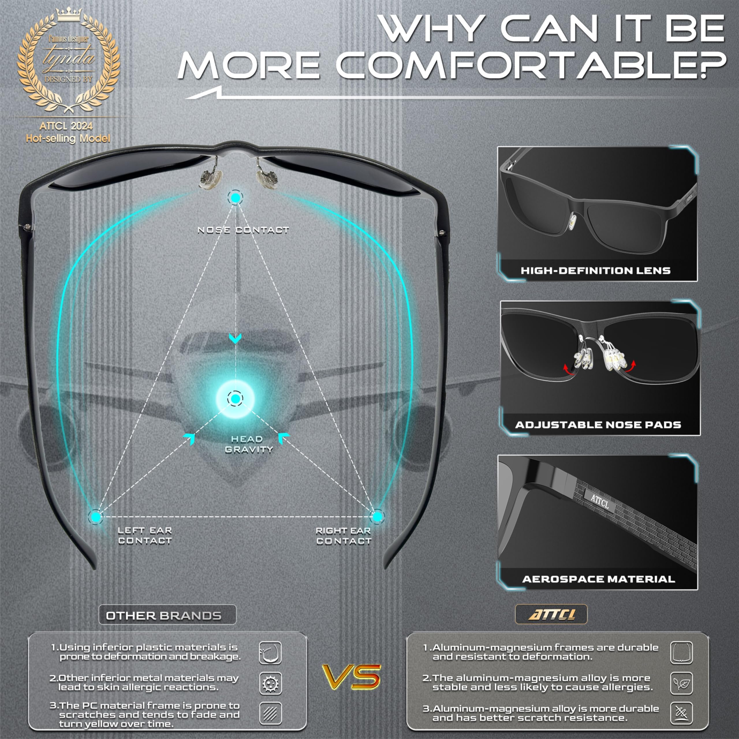 - WHY CHOOSE US? -【Aerospace-grade AL-MG Frame】- ATTCL Polarized Sunglasses men are stronger, ultra-light, ultra-hard, flexible, corrosion-resistant. 27% lighter than steel frame, stronger than TR90, premium Than plastic; All make this mens sunglasses polarized Ideal for Beach, Driving, Fishing, Golfing, Travel, and more.