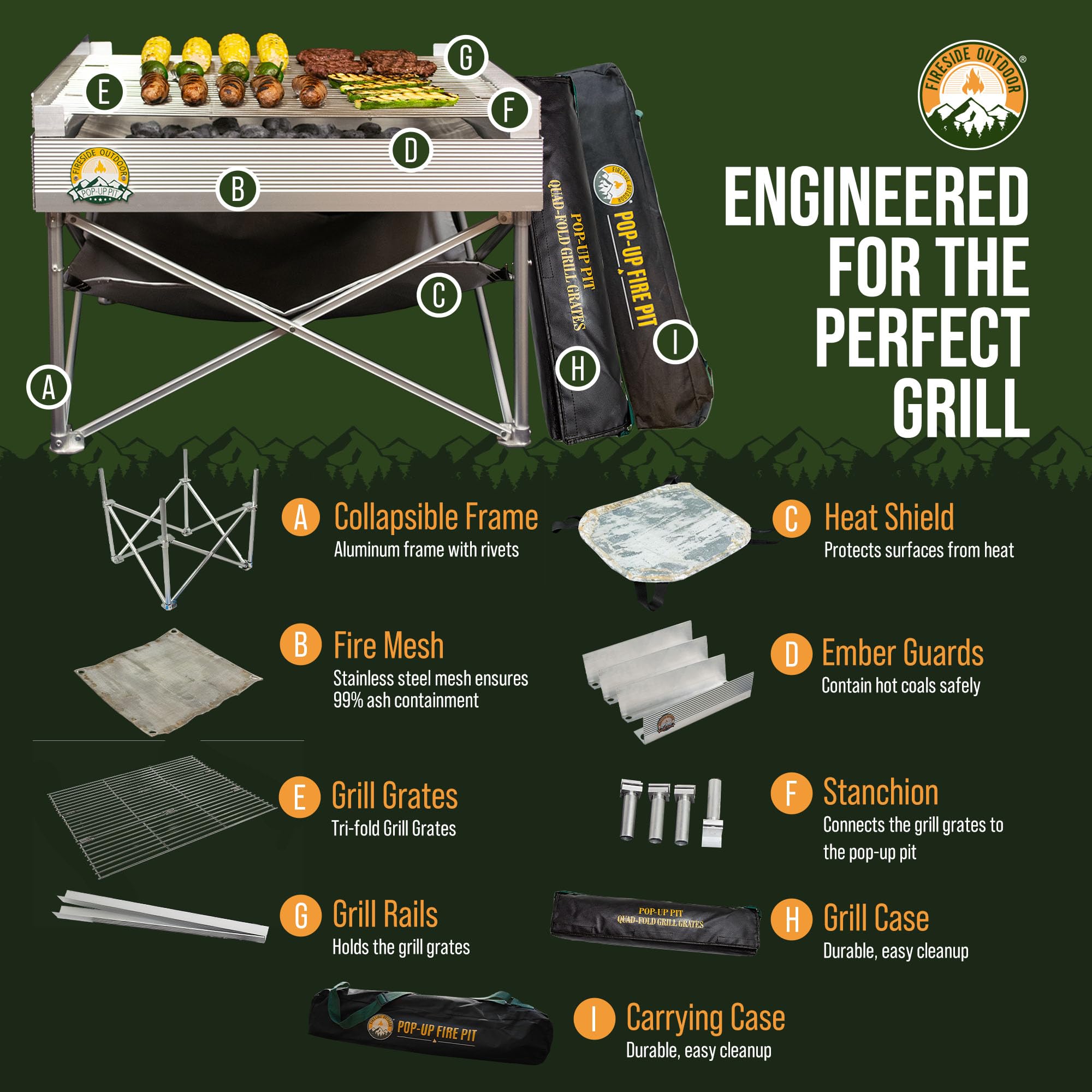 Kit includes: Pop-Up Fire Pit Heat Shield Tri-Fold Grill Grates
