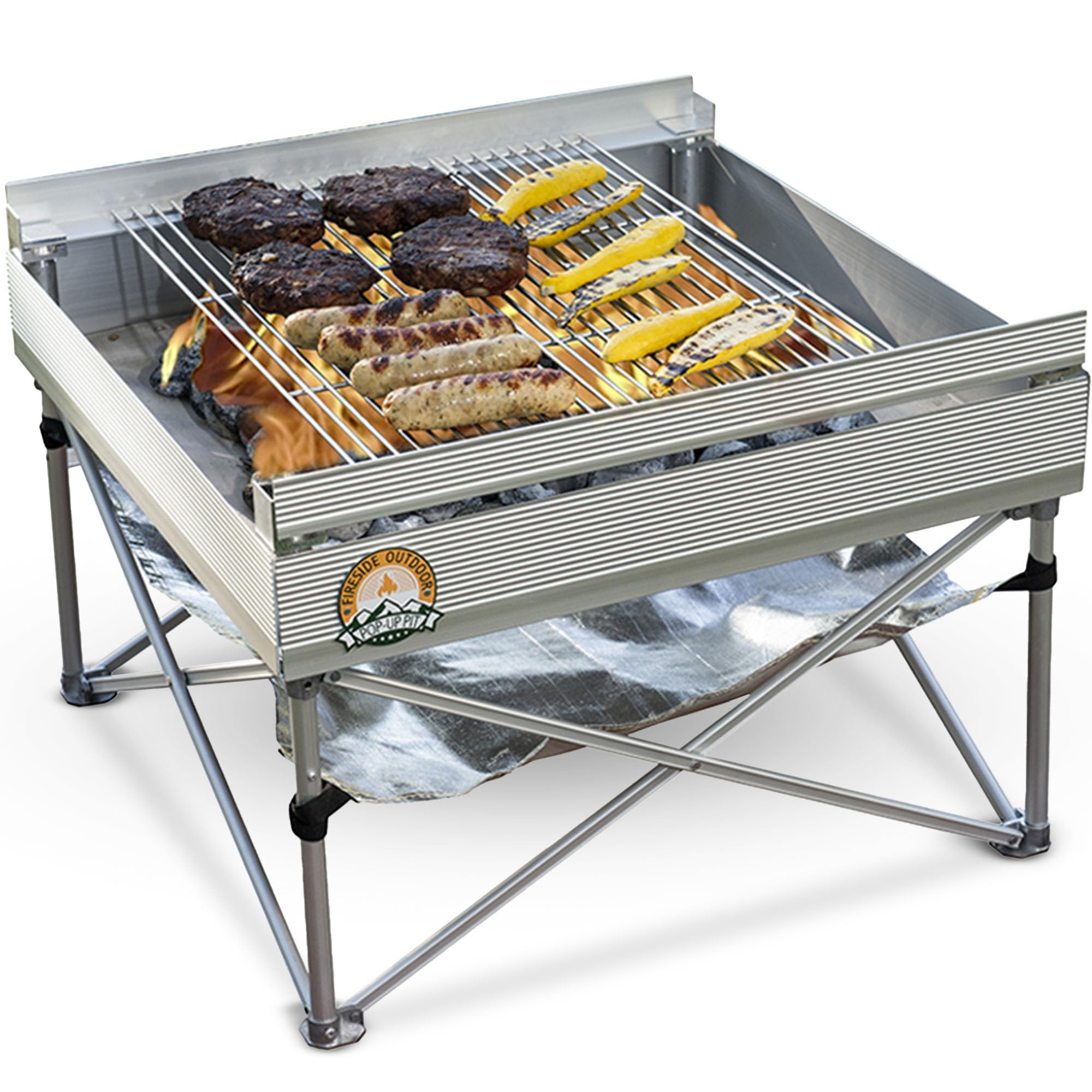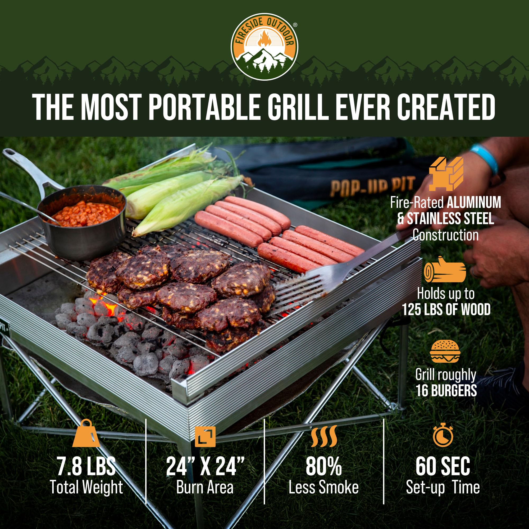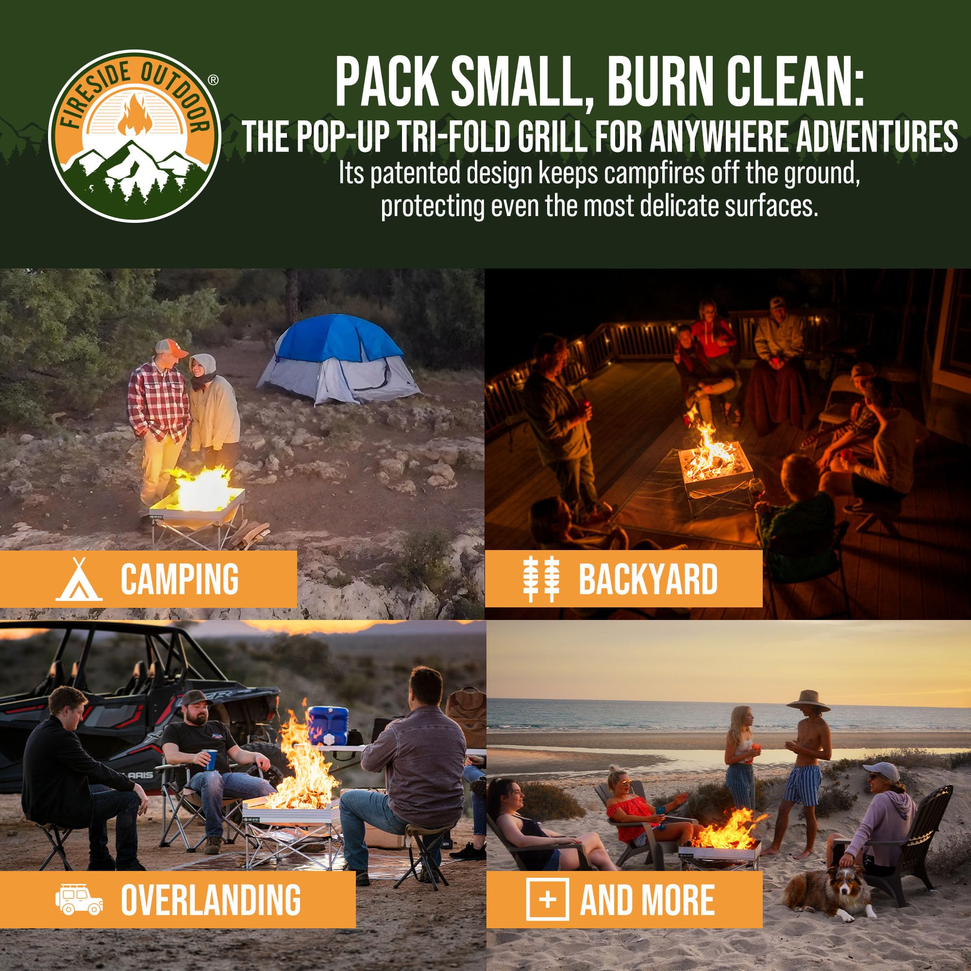 Fireside Outdoor Pop-Up Fire Pit - Portable Fire Pit, BBQ Grill, Charcoal Grill, Folding Fire Pit, Camp Grill, Portable Campfire, Outdoor Fire Pit with Grill and Heat Shield - Tri-Fold Grates