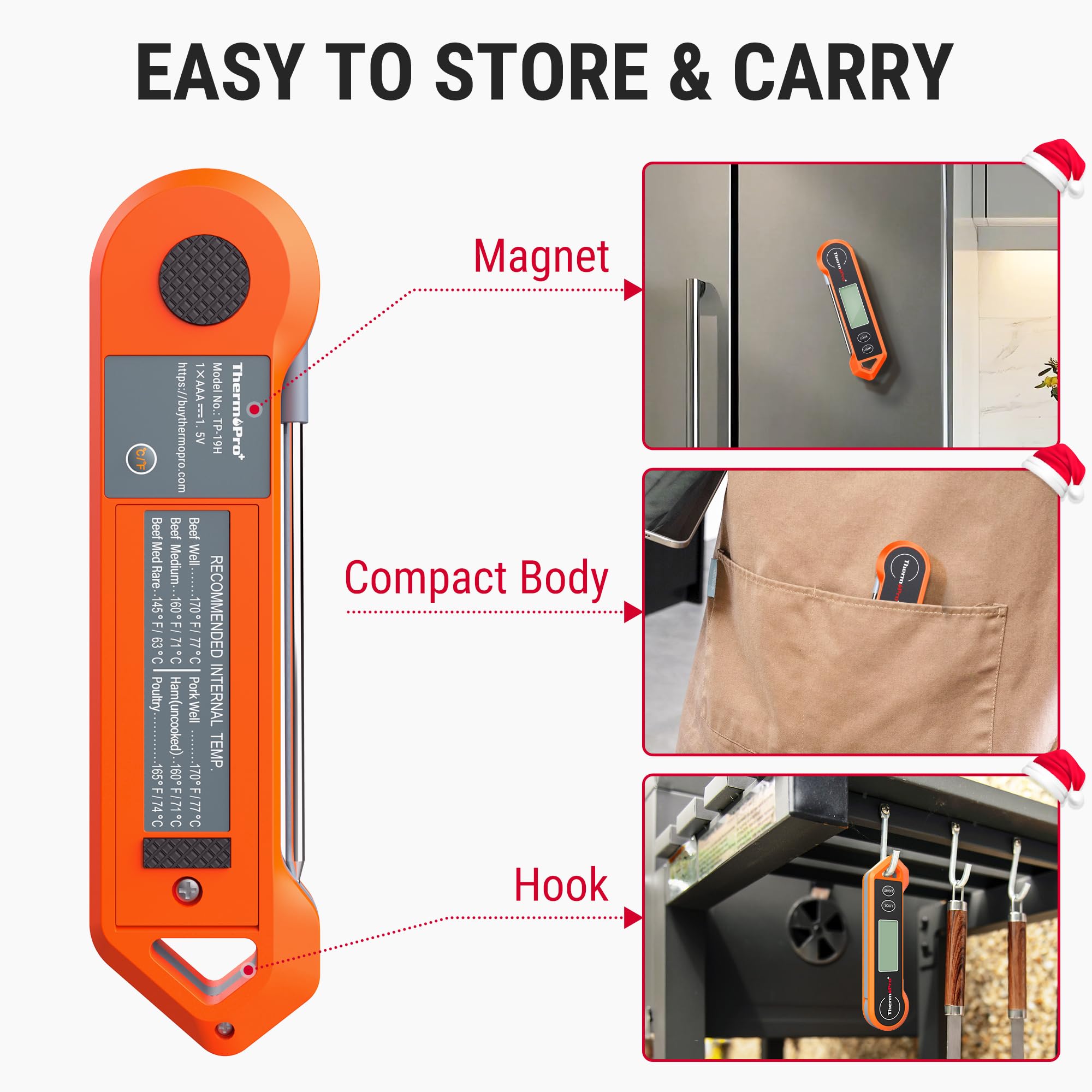 ThermoPro: Cook Like A Pro Every Time! The ThermoPro TP19H digital kitchen thermometer with a simplistic yet practical design, and a push of the button, the foldaway probe will pop open for quick an easy temperature reading, and when you're done taking the temperature measurement you can fold the probe back in to ensure the probe is kept safe and clean. Stop overcooking or under-cooking your meat and Perfect for all sorts of cooking activities such as meats, baking, candy, liquids and BBQ, etc. The meat thermometer with a backlit display which assists you reading the display in the dark BBQ Thermometer Features: - Unique Fast Reading system achieves an accurate temperature reading within 3 - 4 seconds - Ultra-clear backlit display - Foldaway probe is designed for safety and cleanliness - Battery power saving design - Celsius/Fahrenheit selector Cooking Thermometer Specifications: - Temperature Range: -58°F to 572°F (-50°C to 300°C) - Battery: 1 x AAA battery - Temperature Accuracy: ±0.9°F (±0.5°C)
