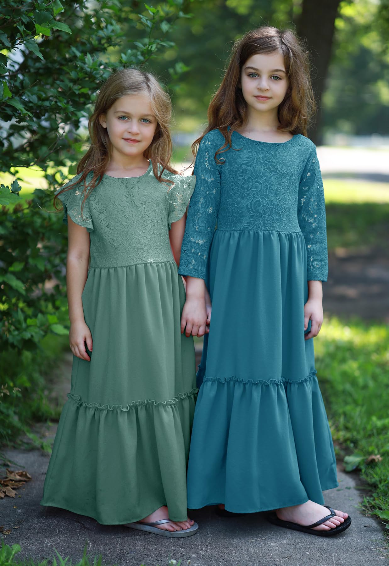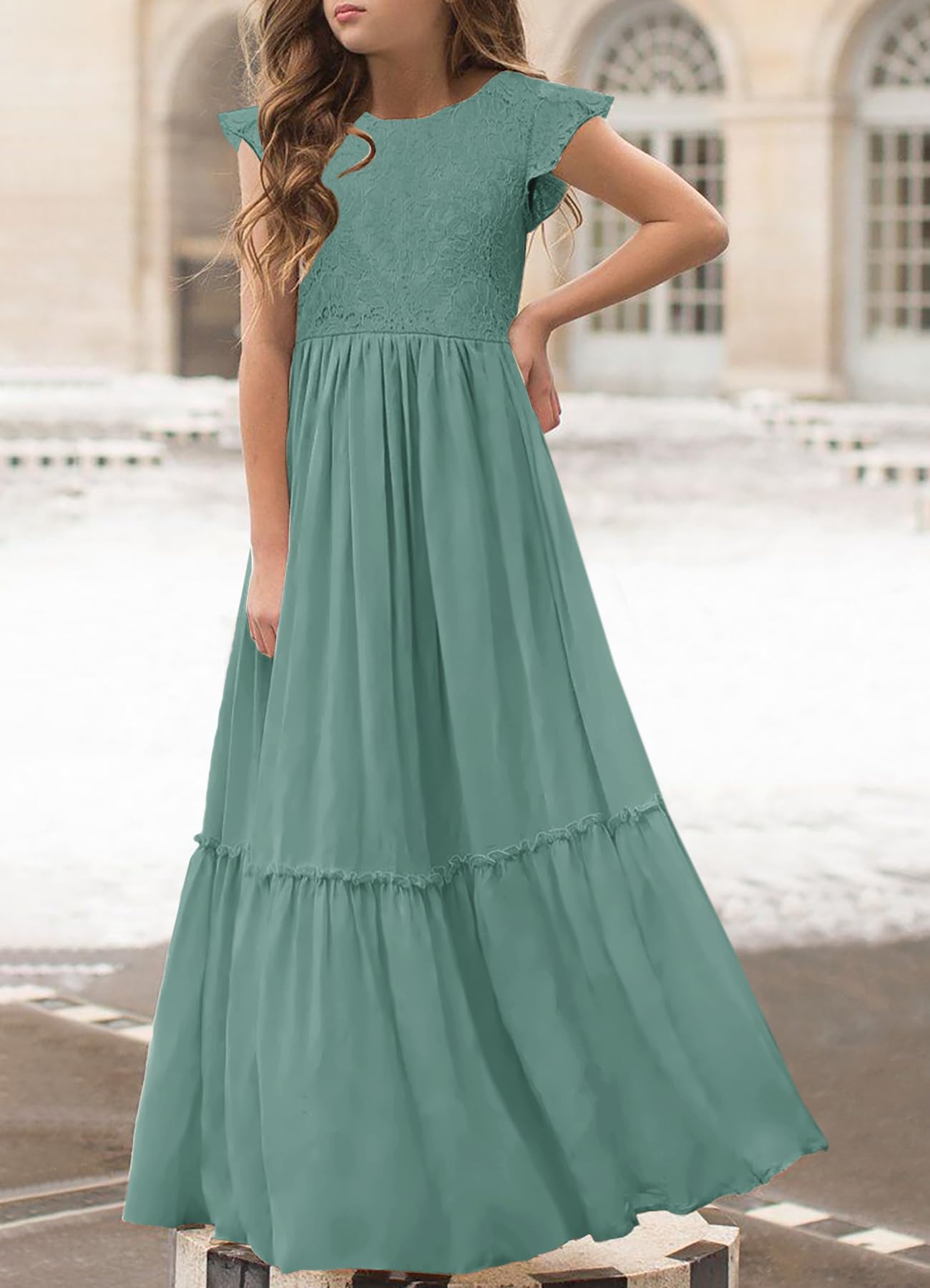 MITILLY Girls Lace Flower Ruffle Sleeve A-Line Swing Wedding Party Maxi Dress with Pockets