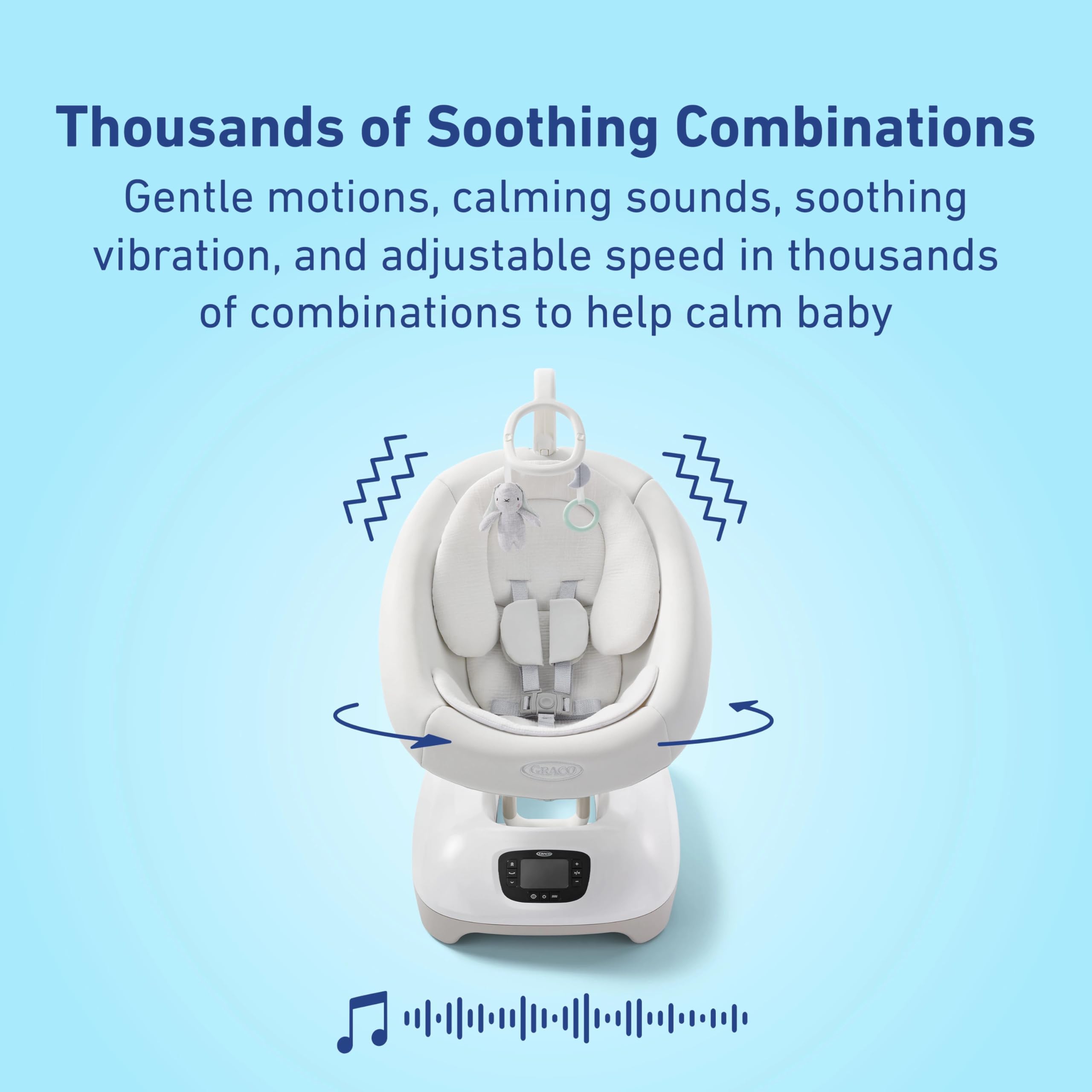 The Graco SmartSense Baby Swing is designed with innovative Cry Detection Technology which responds intuitively to your baby's cries by adjusting the swing's settings to soothe the baby automatically. Gentle on baby's skin, the swing seat is made with soft cotton fabrics and includes a cotton infant body support for comfortable snugness. This advanced swing offers 4 soothing motions, 3 swing speeds, and calming vibrations to match your baby's preference, along with 15 soothing songs and sounds for a peaceful environment.