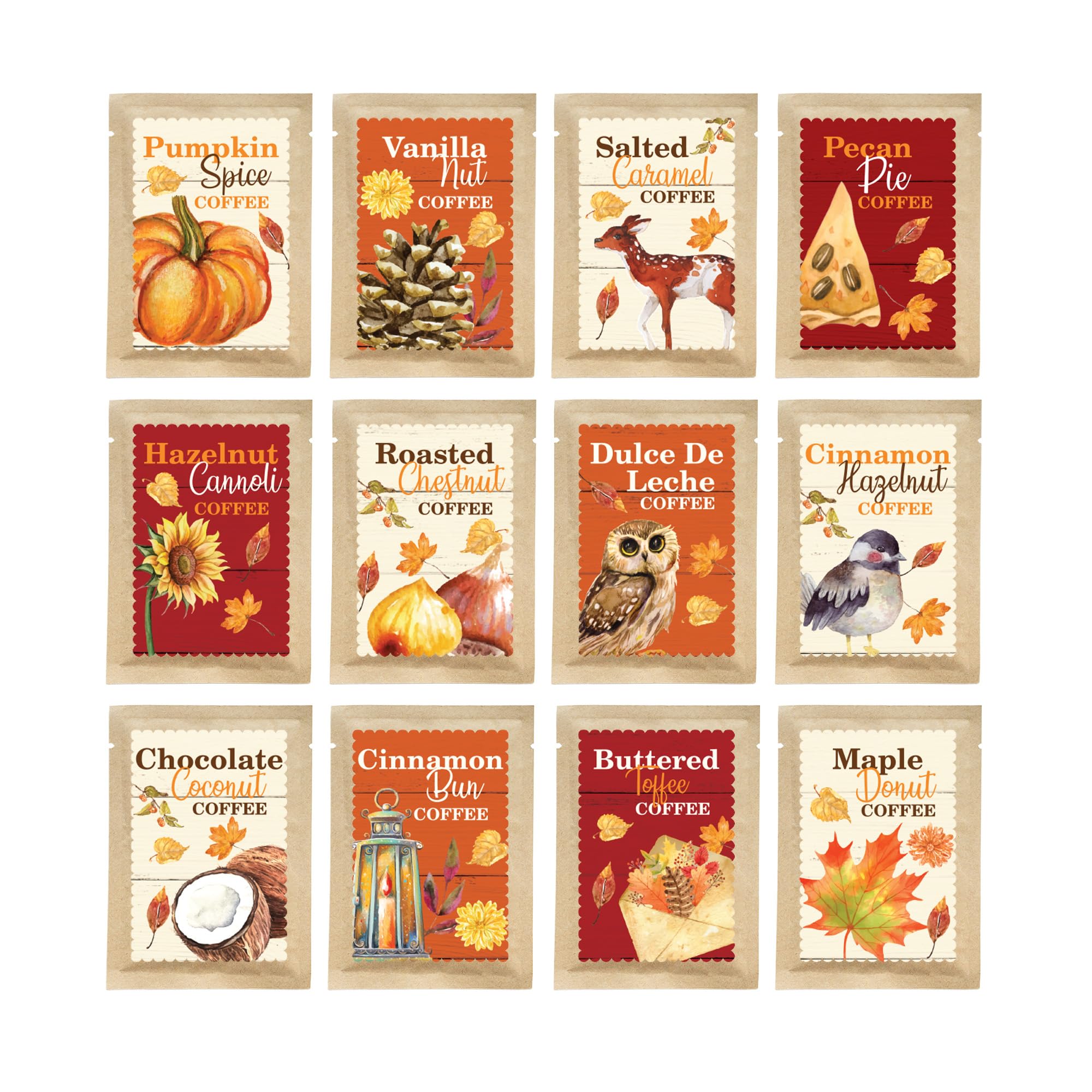 - Fall collection variety pack contains 12 different coffee packets of flavored coffees to cater to everyone's tastes, each with 1 oz of pre-ground coffee. 12 oz total.