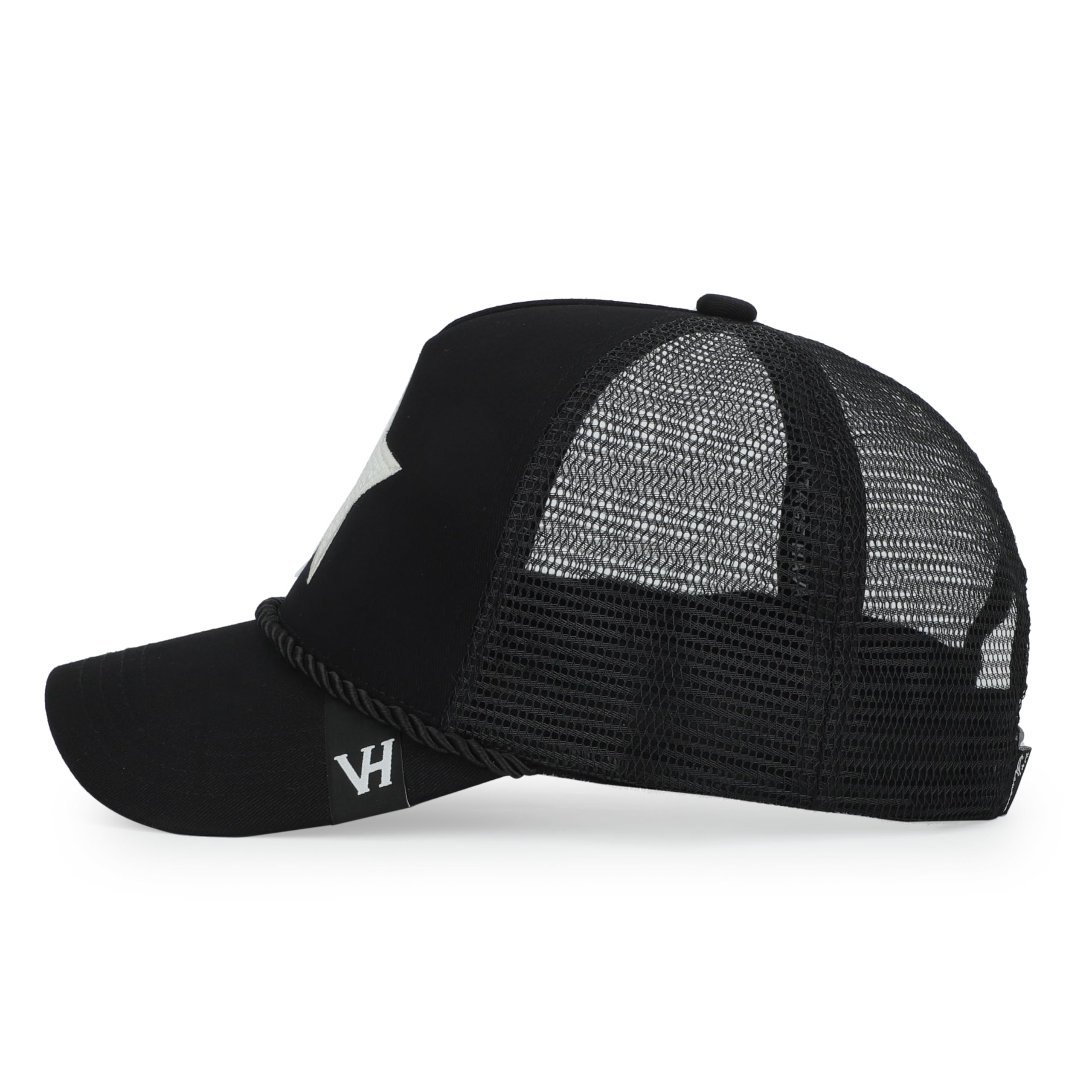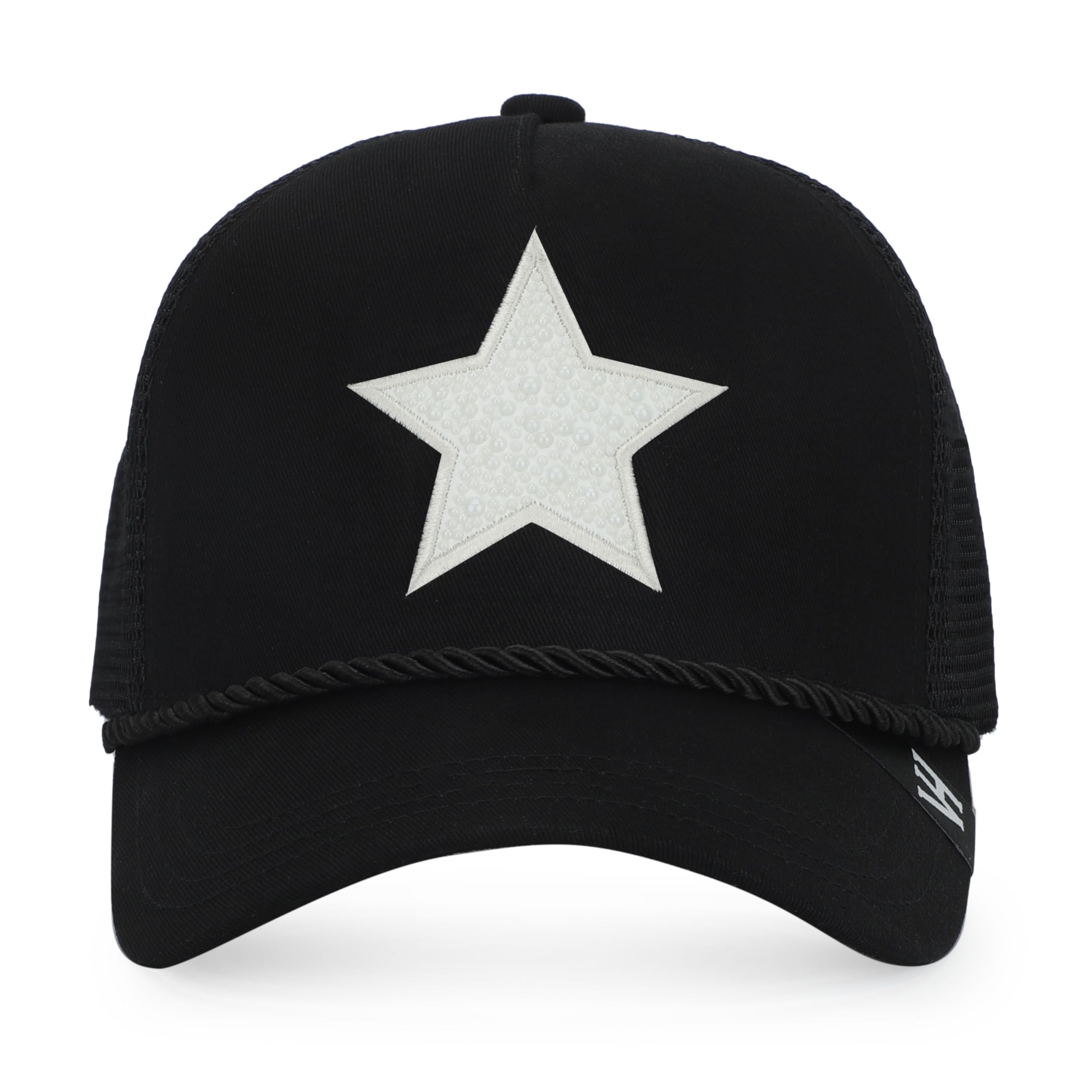 - Stand Out in Style with our Black Trucker Hat featuring a captivating white star embellished with pearls. The hat's distinct charm lies in its attention-grabbing visor adorned with a unique rope design, adding a touch of flair to the classic trucker style. Make a statement with our one-of-a-kind Trucker Hat that effortlessly combines glamour, individuality, and comfort.
