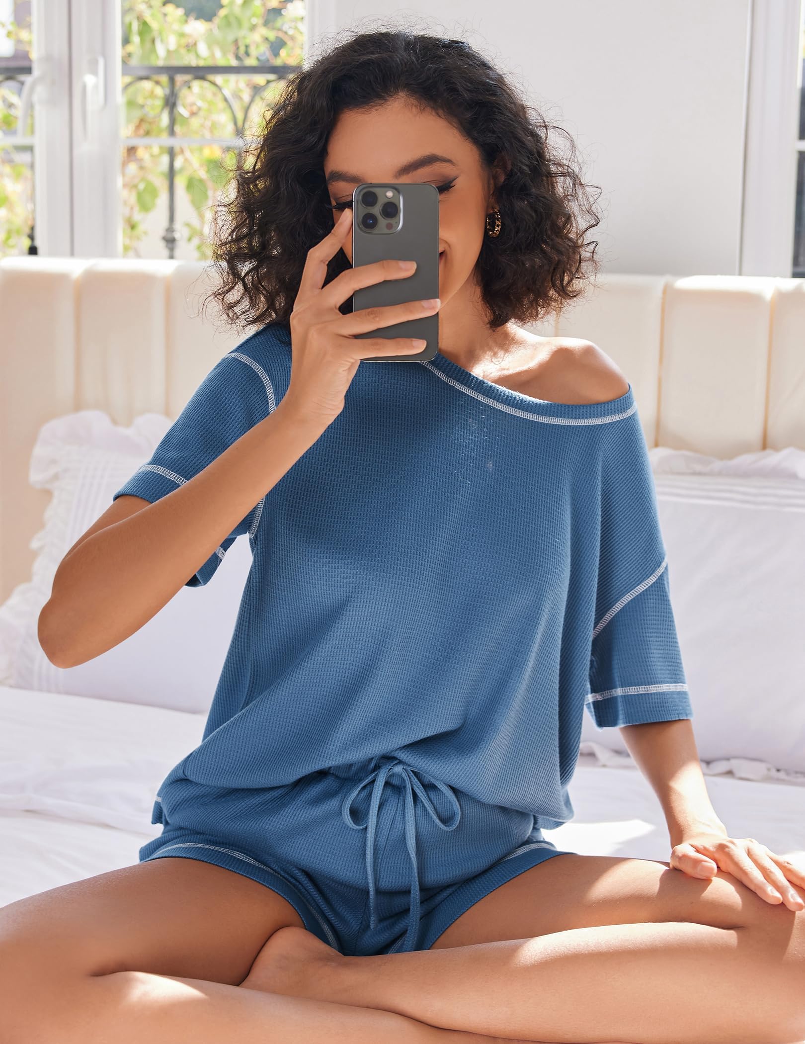 - MATCH: Waffle shirt tops can easily match with skirt, leggings, skinny pants, jeans or also pajama. Pajamas for women set shorts can be worn with all t-shirts for a casual look. 2 pieces sets match with sneakers, sports shoes perfectly.