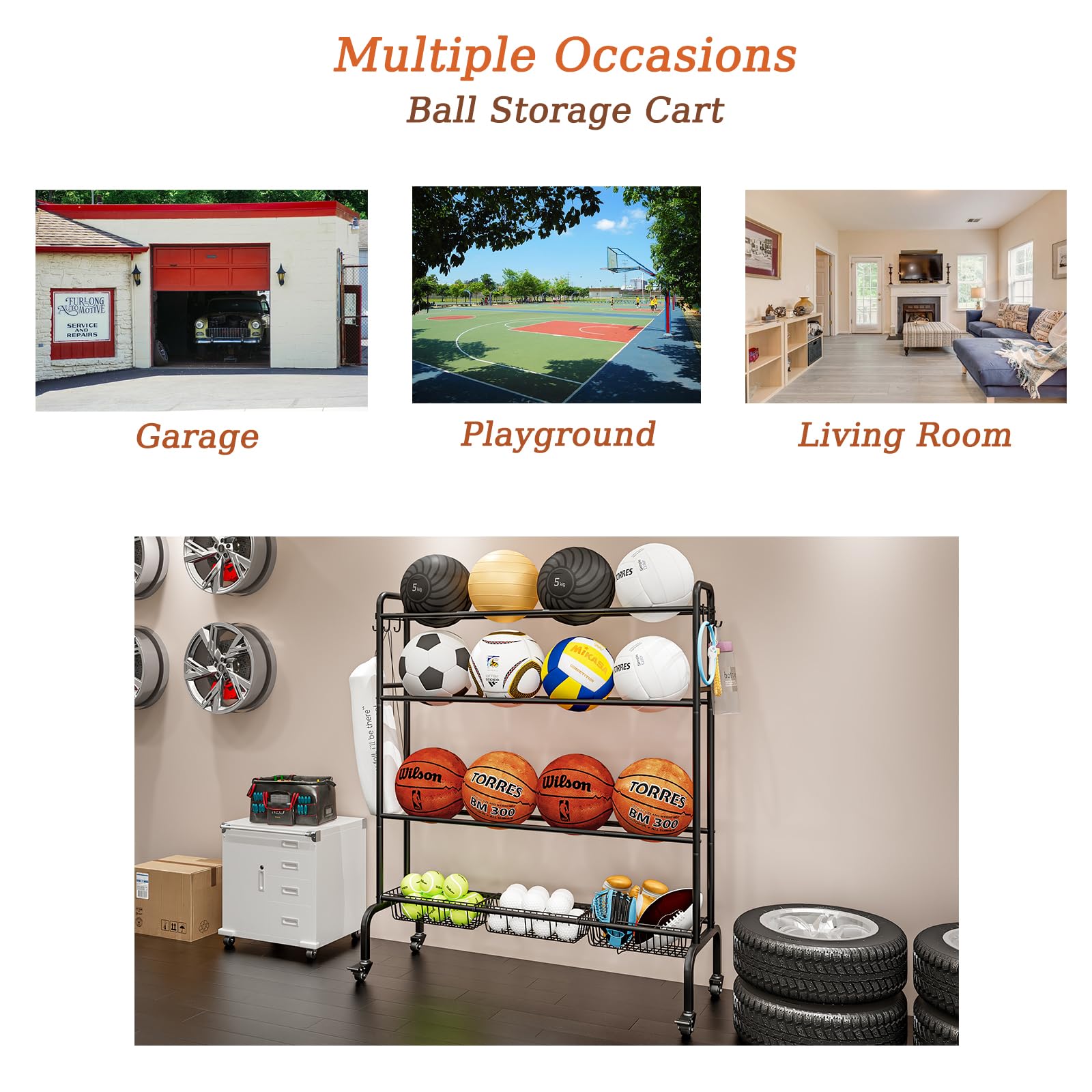 - 4 Layer Sports Equipment Storage Rack: The sports equipment storage rack has four layers and can be used to store various balls, such as basketball, volleyball, and football. The net basket at the bottom can be conveniently used to store small sports equipment, such as rugby, baseball, dumbbells, and skipping ropes etc. And there are three hooks on each side to easily hang sports backpacks and sports clothing.