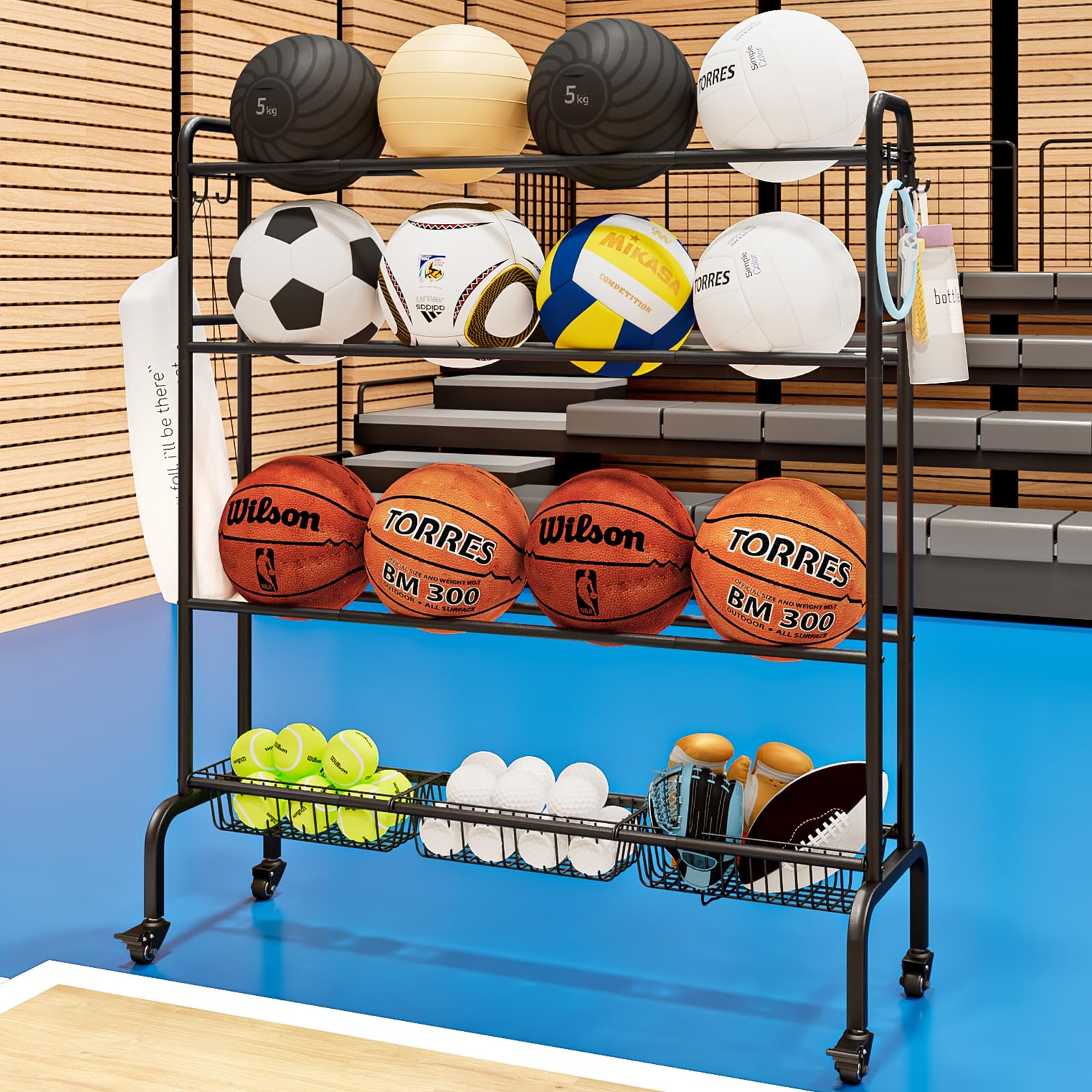 INGIORDAR Basketball Rack, Rolling Ball Stand,Garage Organization with Wheels, Four-Layer Sports Equipment Storage with Baskets for Basketballs Footballs Volleyball,Black