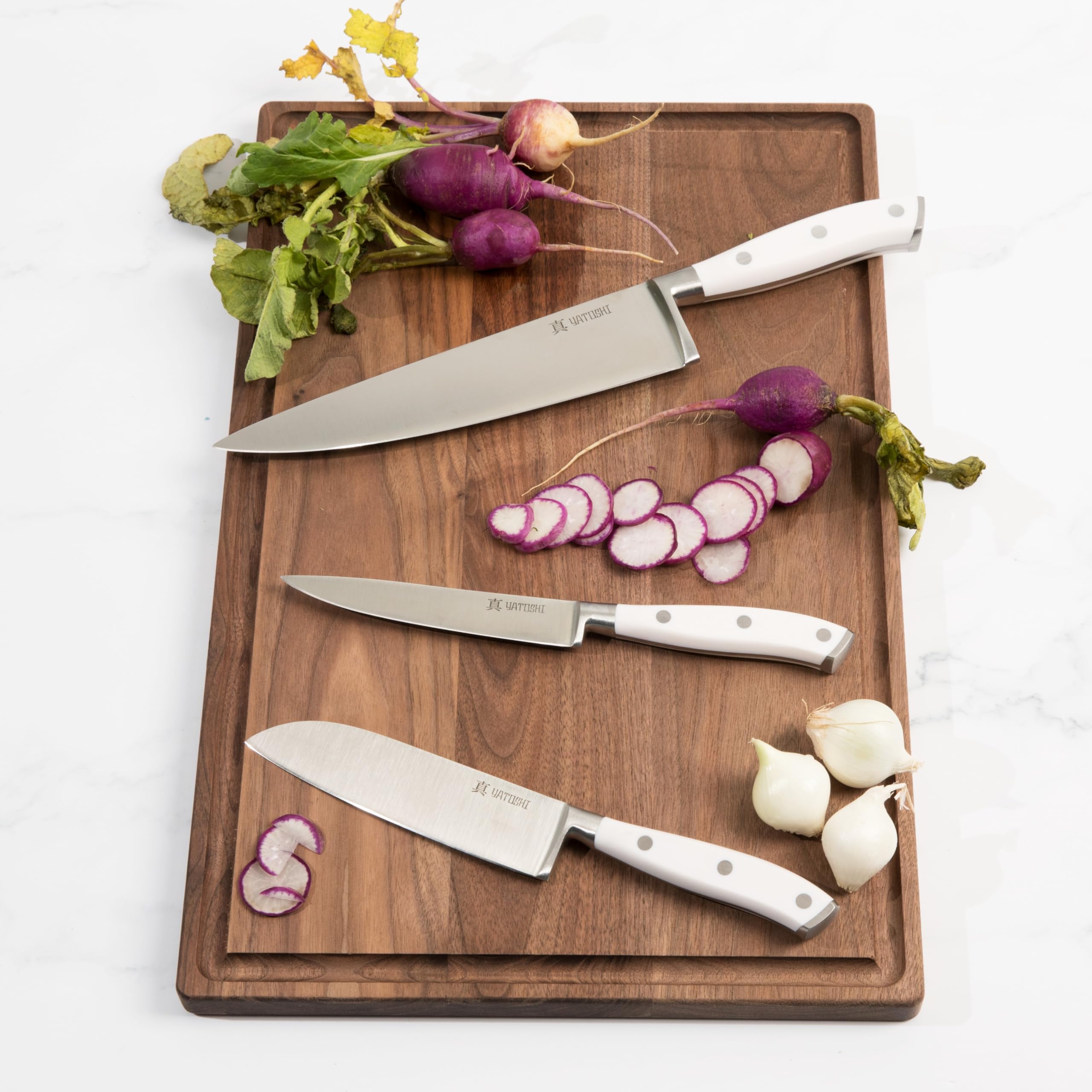 - High Carbon Blades: Made with premium 7Cr17 High Carbon Steel that provides a razor-sharp professional quality blade. The steel contains 0.6-0.75 carbon, making it two times tougher than other knives in its class with a Rockwell Hardness of 57-58.