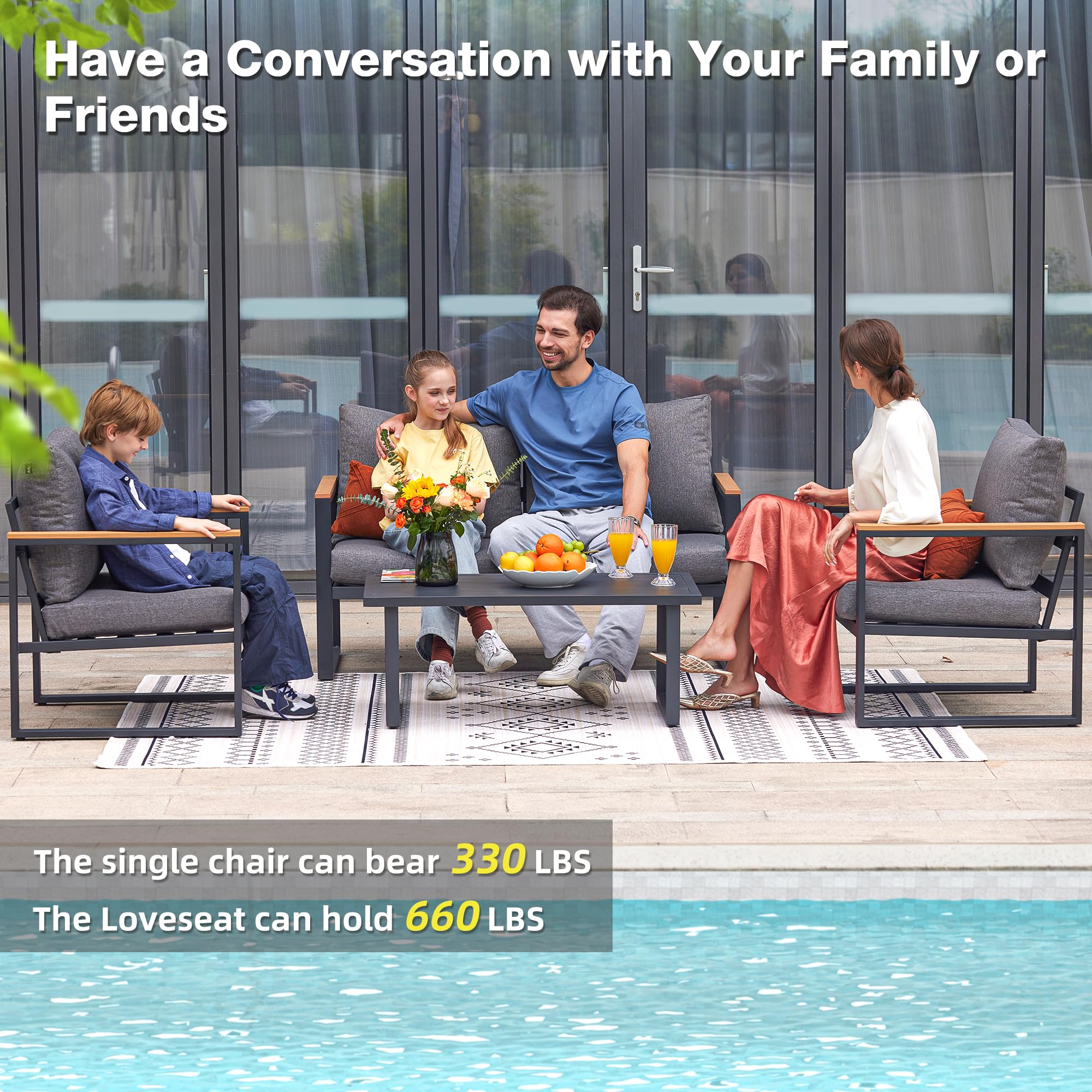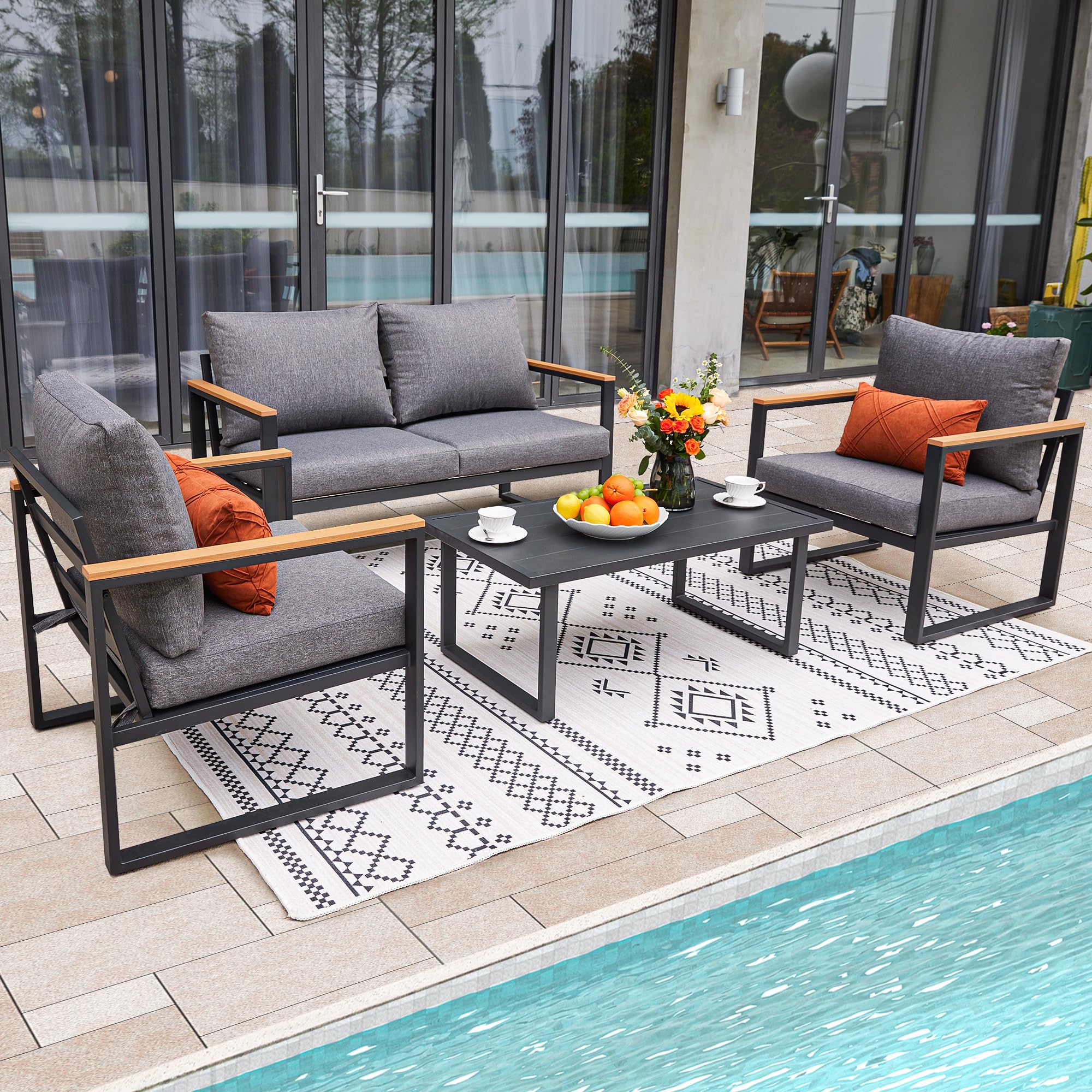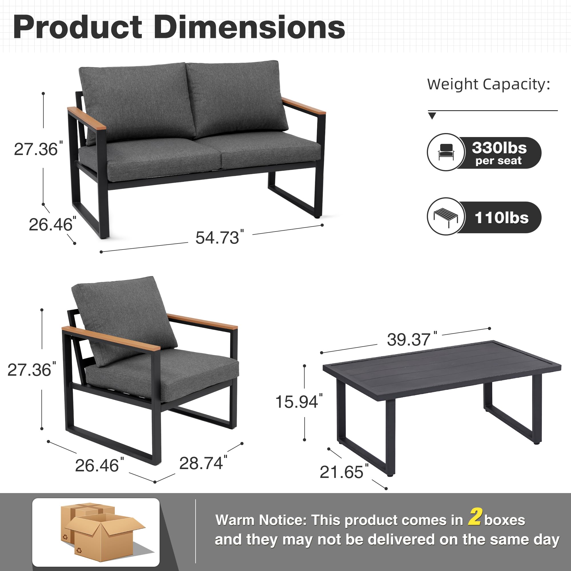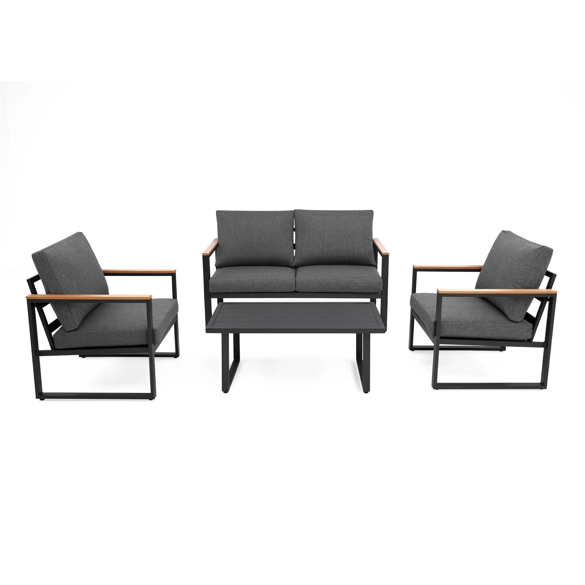 - MODERN AND STYLISH DESIGN:The outdoor conversation set features black-grey metal frame with the touch of modern finish. The arms include heat-treated wood grain coating that give the set a clean and minimalistic look. Also the furniture pieces are light weight and easy to move as needed