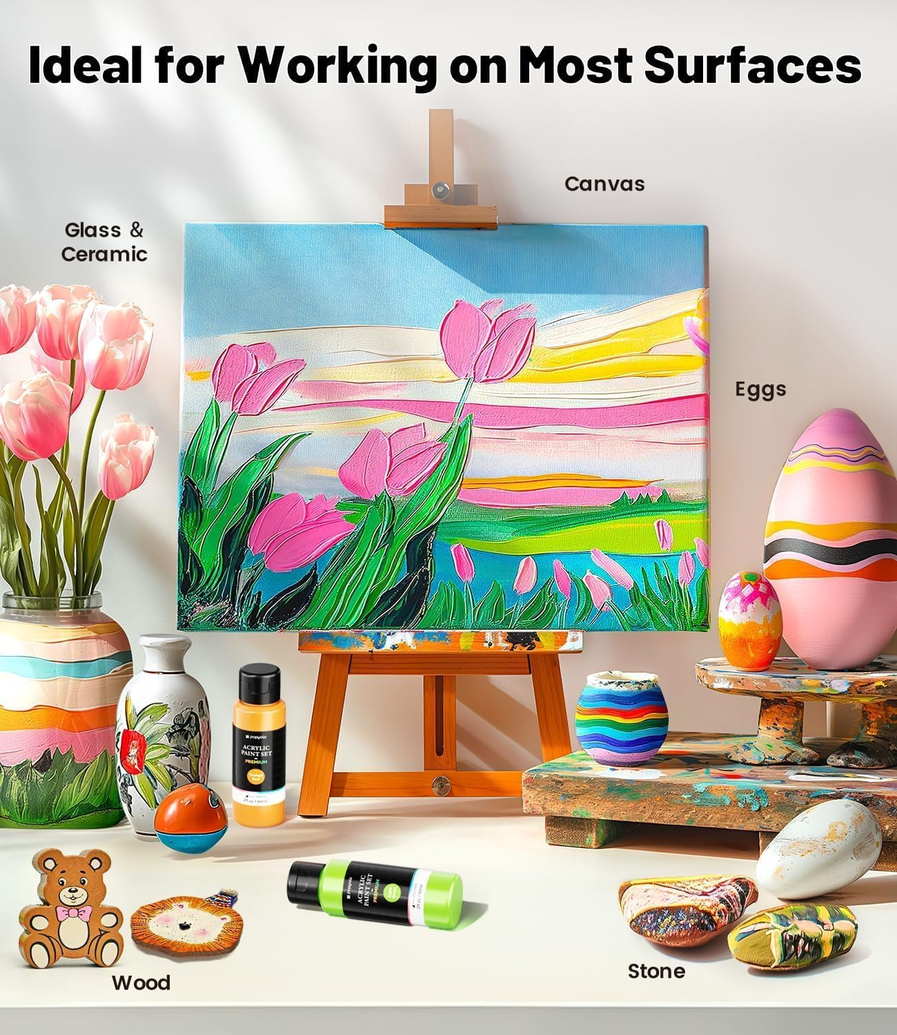 - Multi-Purpose Craft Paint: POPYOLA painting kit is perfect for a wide range of creative projects. Ideal for canvas paint, scrapbooking, and seasonal decorations like Christmas and Halloween. These versatile paints work beautifully on surfaces such as wood, rocks, pumpkins, fabric, stone, metal, plastic, ceramics, glass and more. Whether for personal use or as a thoughtful gift for artists, beginners, students, or kids, this paint kit caters to all levels and interests