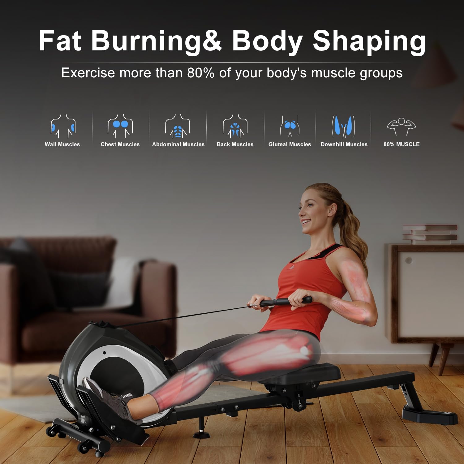Magnetic Rowing Machine for Home Adjustable 8-Speed Booster Burn Fat & Sculpt Muscles Supports Up to 265 LBS Phone/Tablet-Ready Design