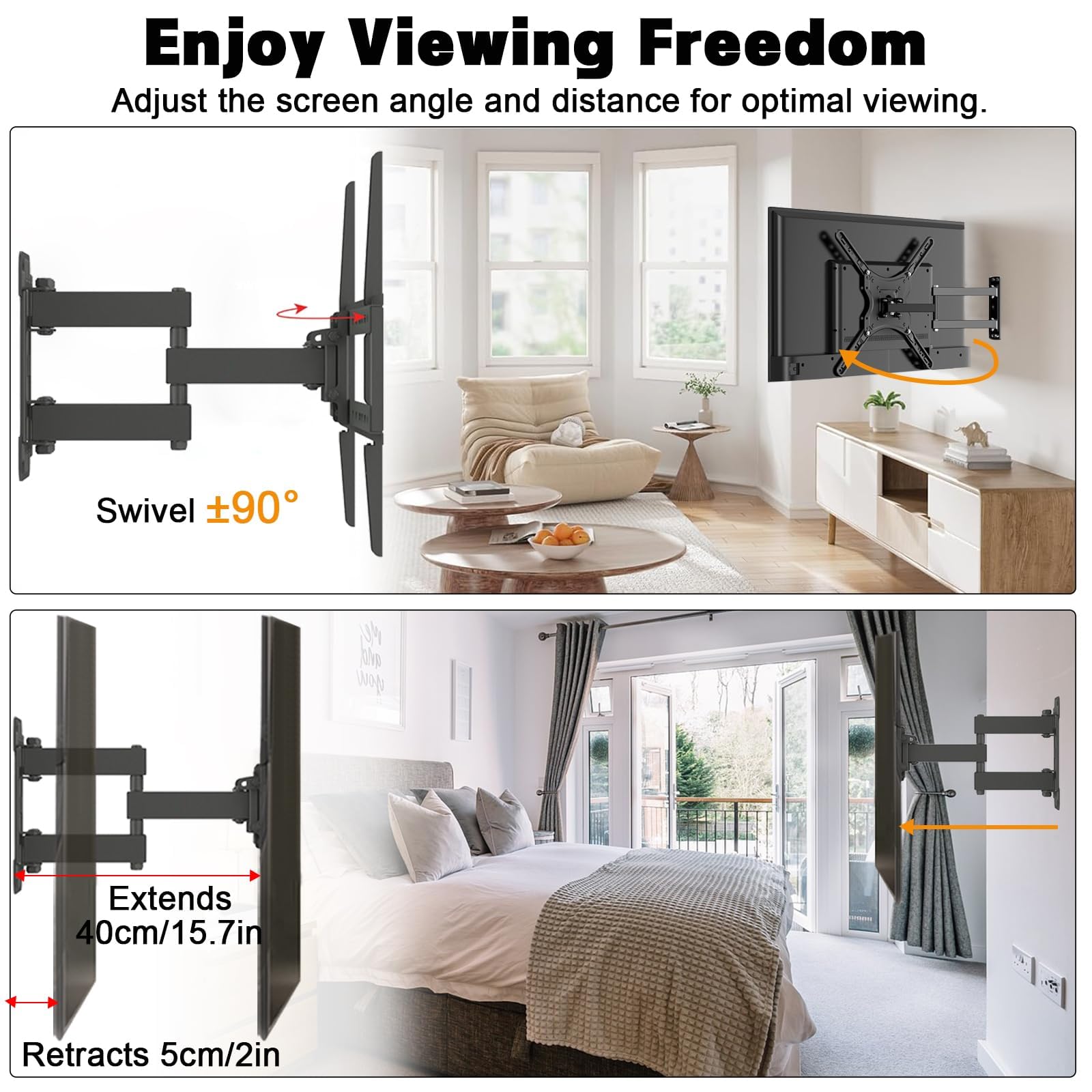 - Designed for Optimal Viewing: Our tv mount 55 inch tilts +5°/-8° for anti-glaring,and swivel +/-90° to the left or right to direct the screen toward your seat position for a more comfortable viewing experience. Universal corner tv wall mount extends 17.71" and retracts back to 2.0" to save space.