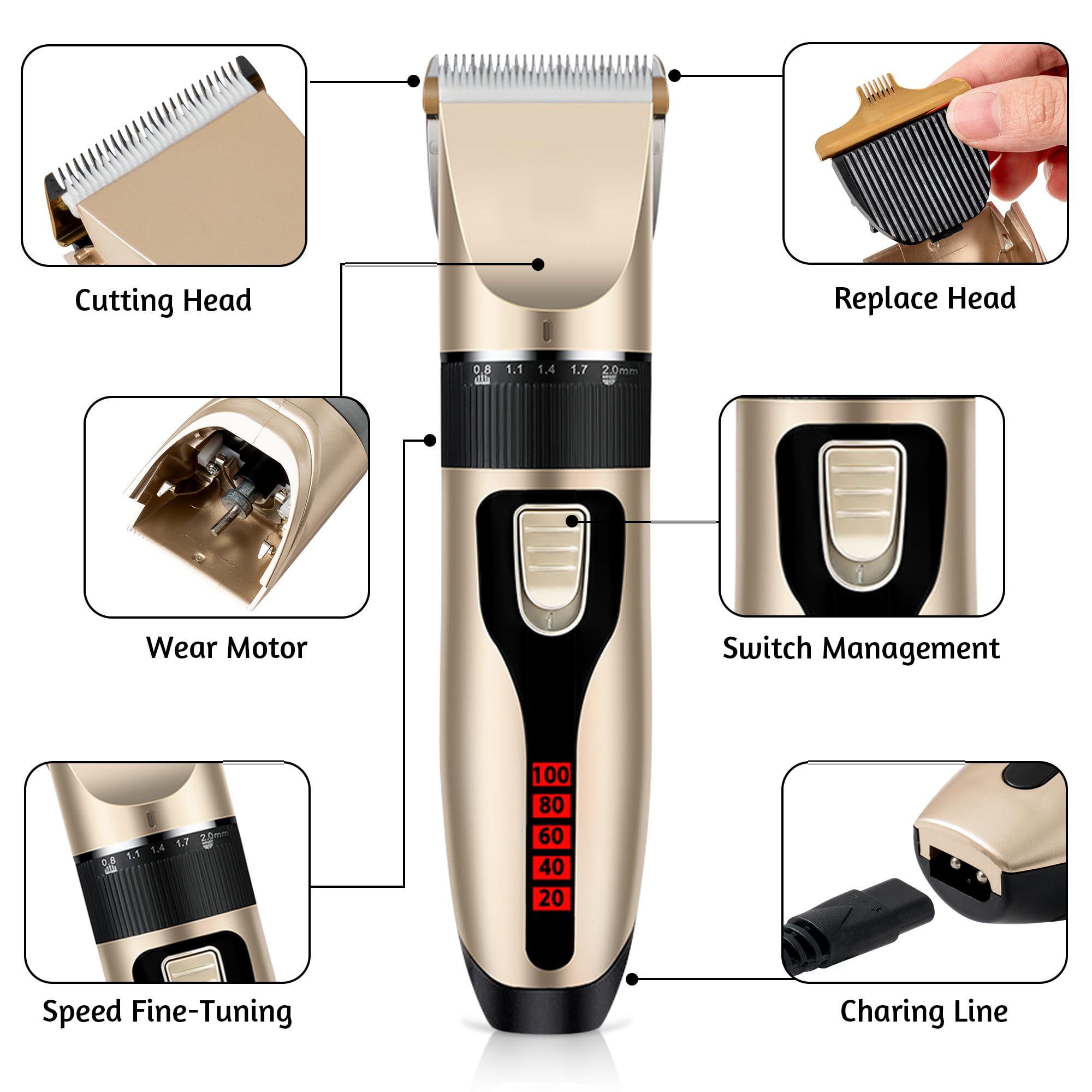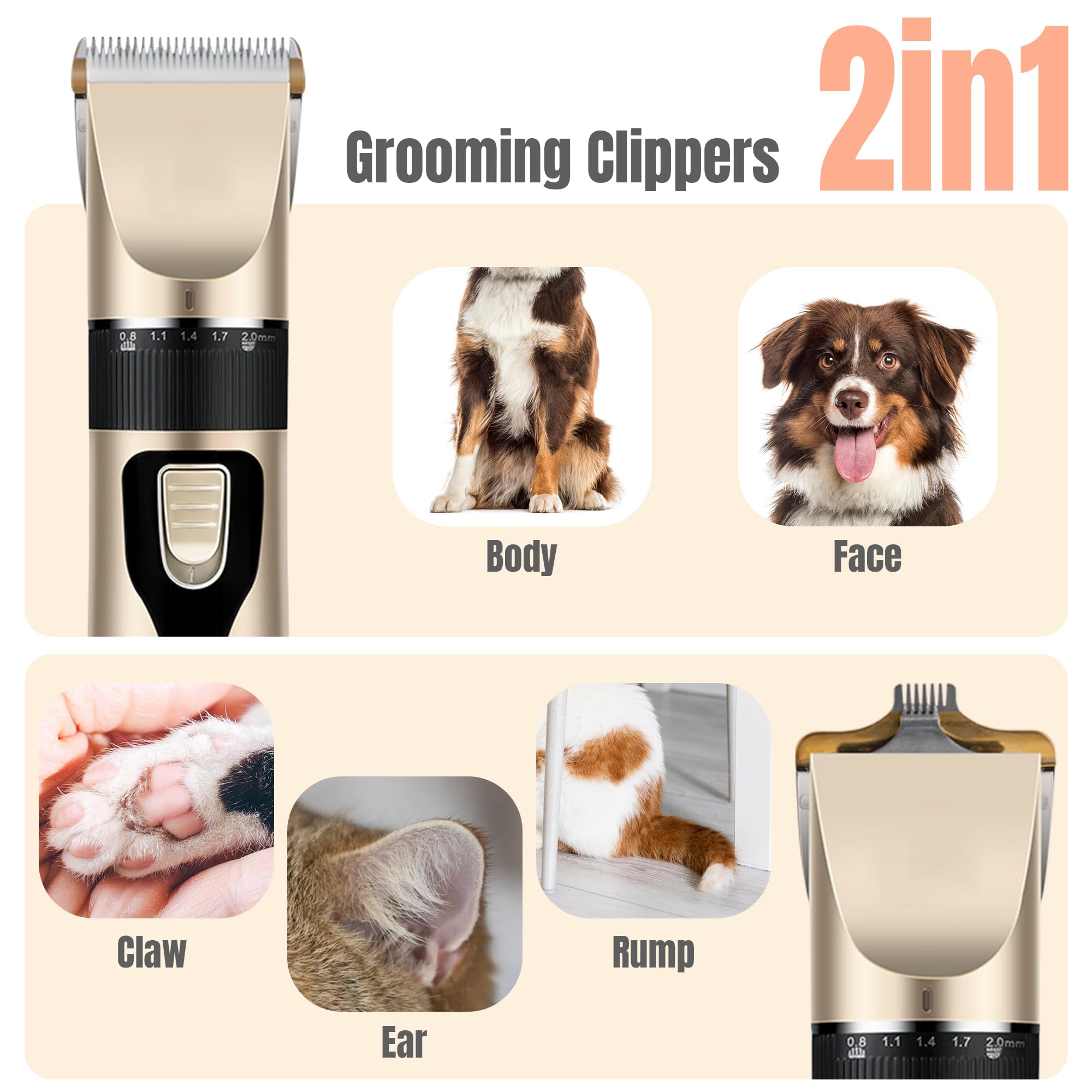 Low Noise Electric Quiet Grooming Kit and Dog Paw Trimmer for Dogs Cats Pets Our pet clippers are designed specifically for trimming dog and cat hair, effortlessly handling different breeds and hair types to ensure a professional and neat trim. The Paw Trimmer is designed specifically for trimming dogs' nails and features a precise blade that allows for easy control of the trimming length, ensuring a safe and effective trimming process. Package: * Pet Steel comb 1*Pet Nail Scissors 1* Pet hair clipper 1* Cleaning brush 1* USB data cable 4* Limit comb 1* Pet nail file 1*Instructions 1*lubricants 1* Scissors