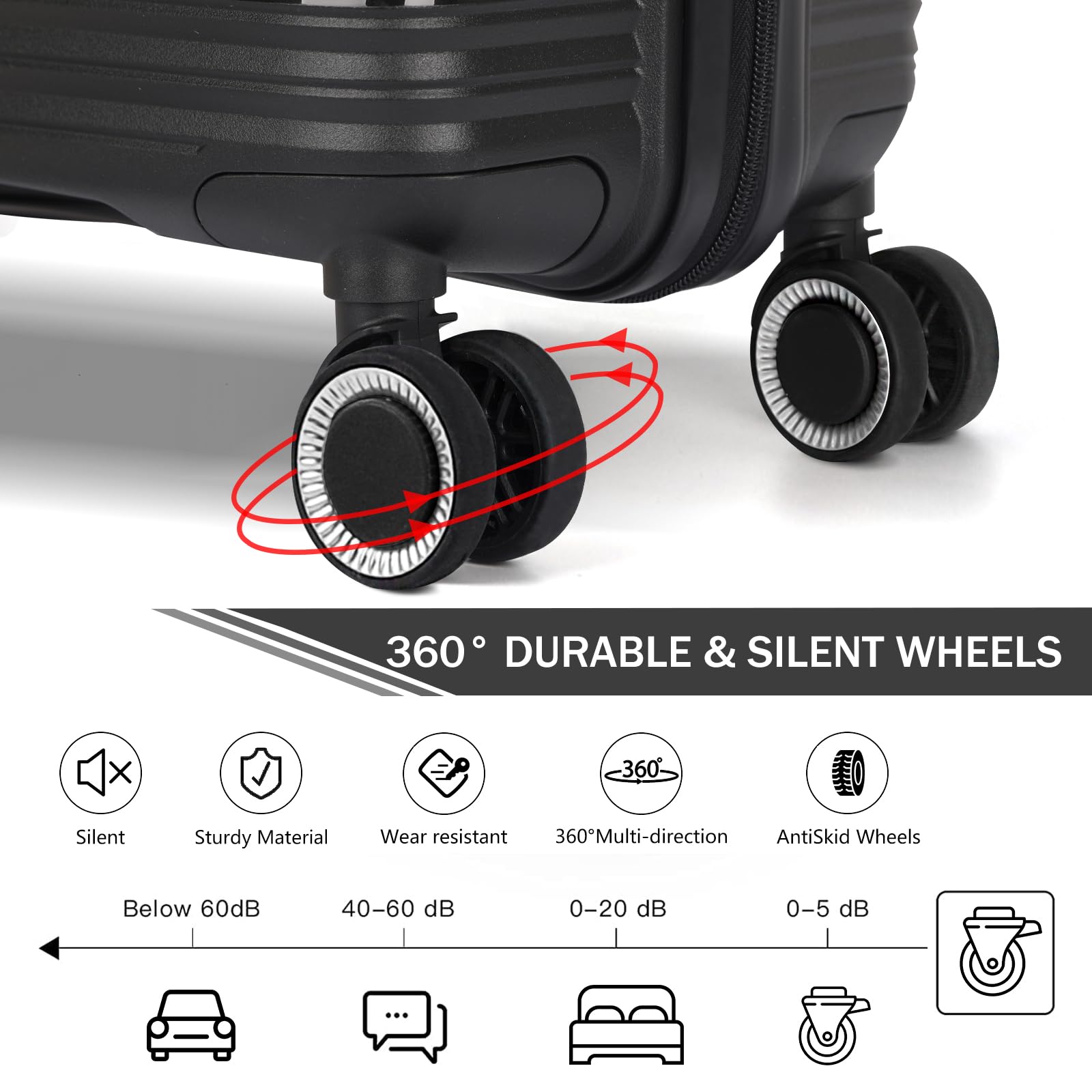 - Silent & Smooth Multi-directional Spinner Wheels - Luggage equipped with 360° degree multi-directional 4 double spinner wheels offer effortless mobility in any direction. The silent feature ensures that the wheels operate quietly, preventing any unnecessary noise during transportation