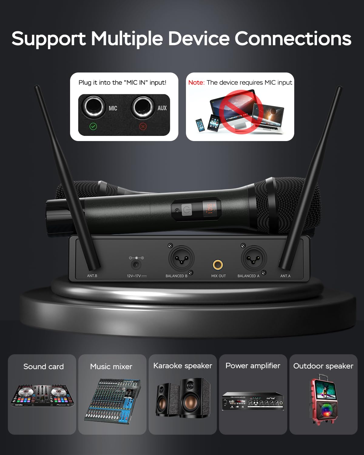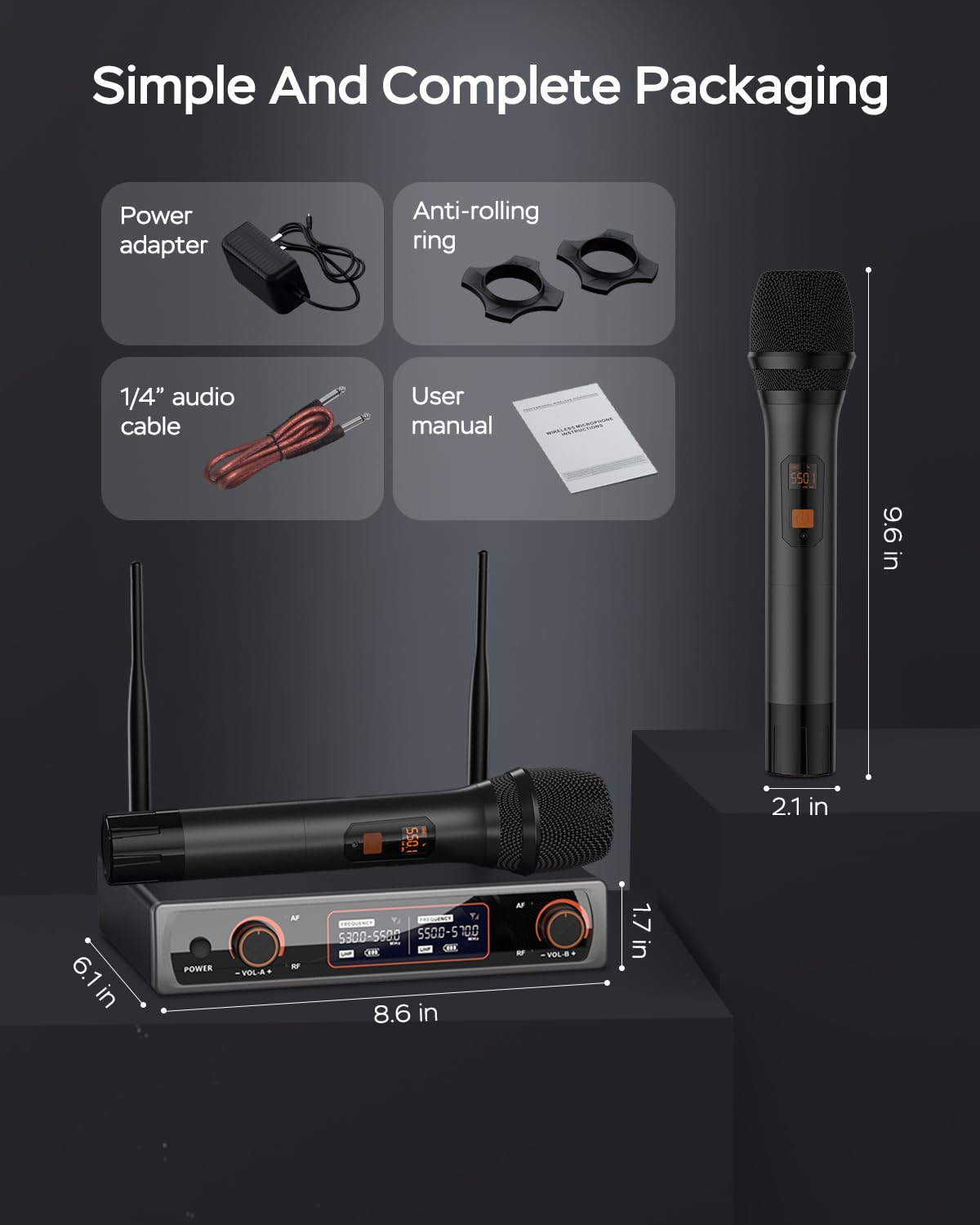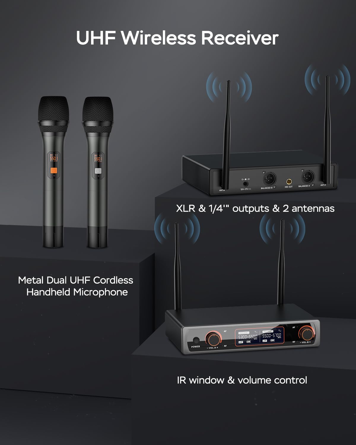 MOYLEAF Wireless Microphones,Metal Dual Professional UHF Cordless Dynamic Wireless Microphone System for Church, DJ, Karaoke,Wedding, Home KTV Set,260Ft