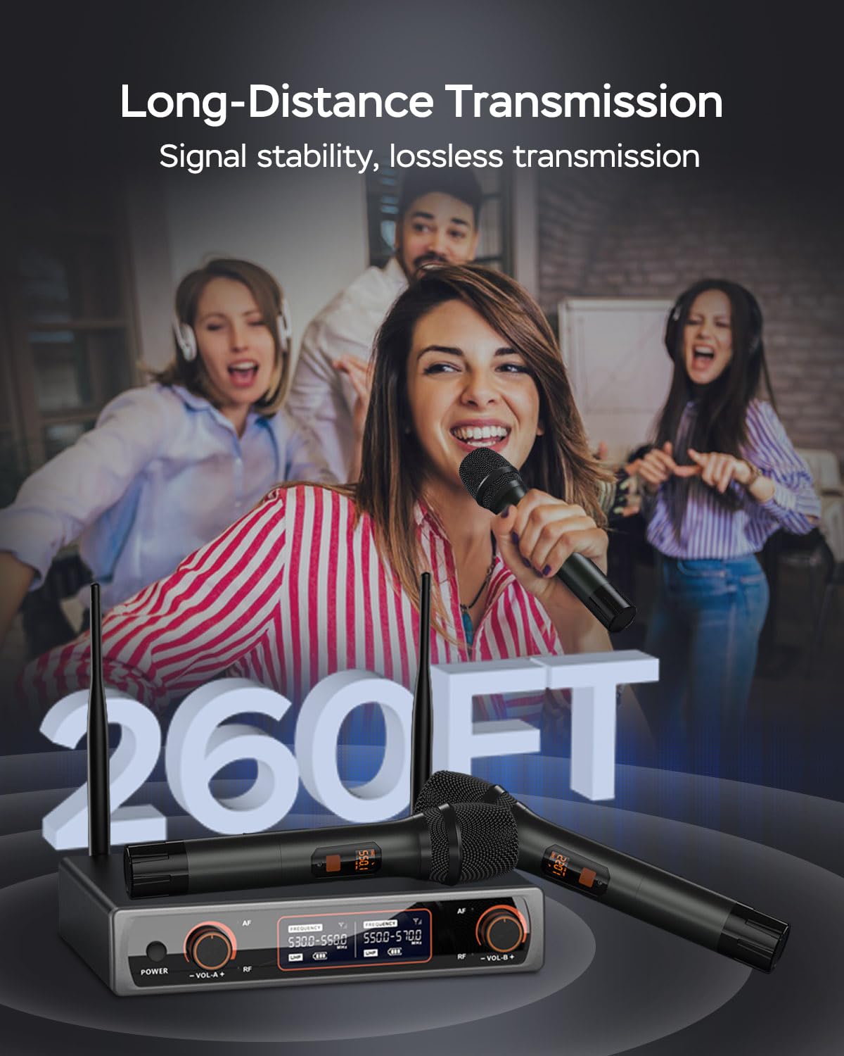 - Long Range Stable Transmission:Each UHF wireless microphone has 25 adjustable channels and can transmit up to 260Ft in open space, while using multiple wireless microphone systems without worrying about interference